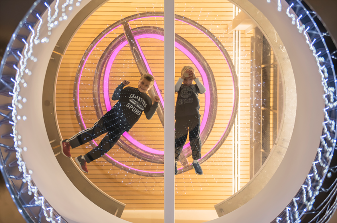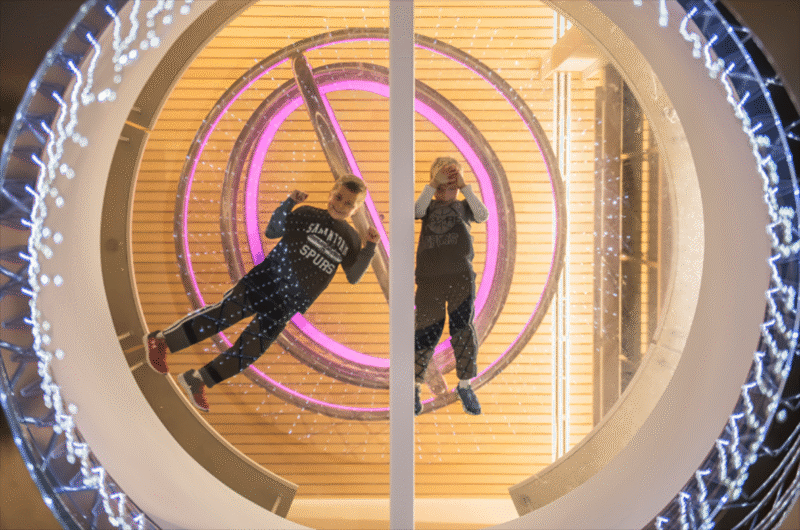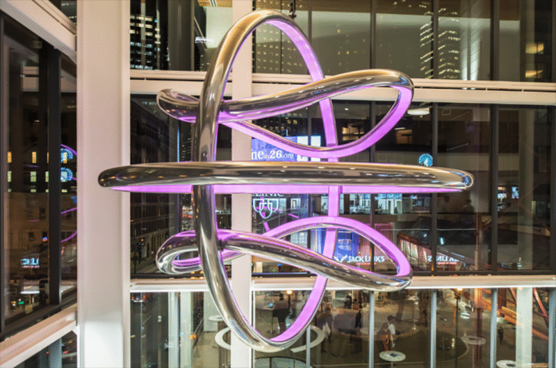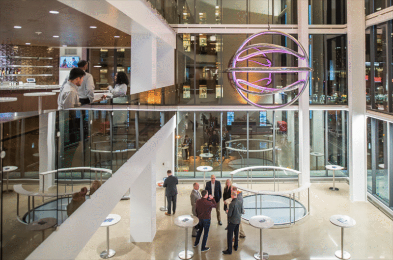 Amid the hustle of a Minnesota Timberwolves game, fans peer through a glass floor at passersby in a lobby below. Looking up, a giant, neon-colored basketball sculpture looms overhead. It’s a moment created for curiosity and connection — designed by Overland Park’s Dimensional Innovations.