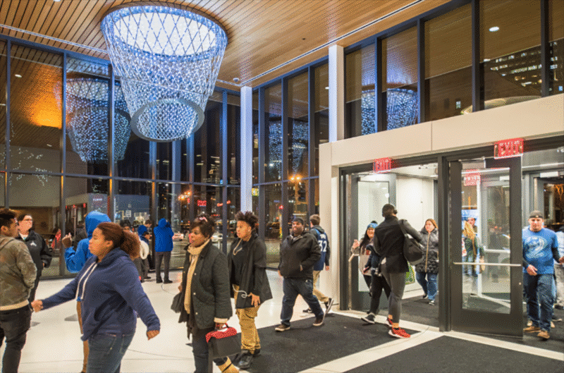 Extending through multiple floors of the four-story Target Center in Minneapolis, the eye-catching ball-and-net visual element is a key component of a $145 million overhaul of the nearly 30-year-old sports and concert venue.