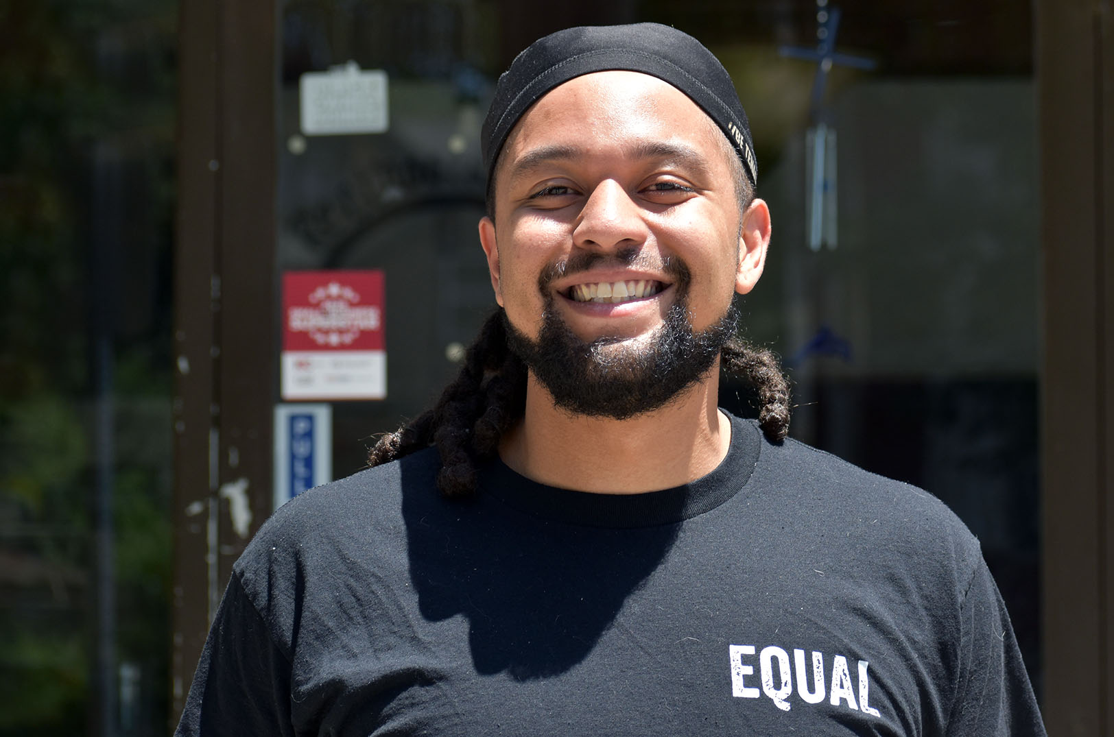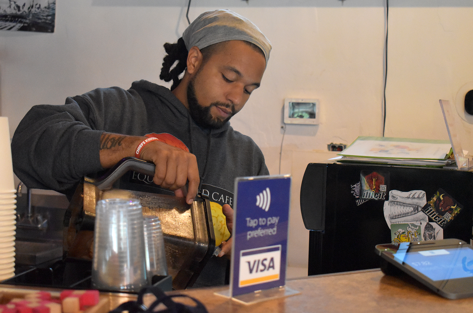 Dontavious Young works on a customer’s drink order in August 2024 at Equal Minded Cafe; photo by Taylor Wilmore, Startland News