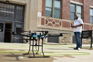 “We couldn’t go in with bleach and kill all the grass [below]; so we haved demoed the product on a couple of our buildings, and so far, it’s been successful,” Brain said. “… Basically we’ve got a rig on the ground that is taking the water and chemical, mixing it and then pumping it up to the drone to spray on the windows. The drone is really the paintbrush that the operator is controlling.”