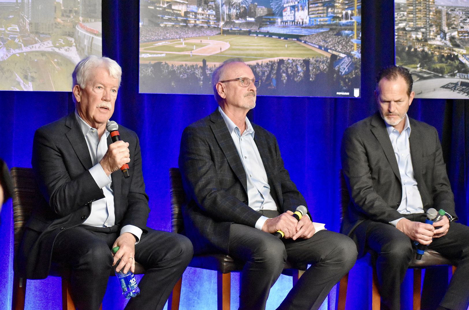 John Sherman, chairman and CEO of the Kansas City Royals, sits alongside Earl Santee, Populous, and Brooks Sherman, Royals, during an announcement event at Kauffman Stadium; photo by Taylor Wilmore, Startland News