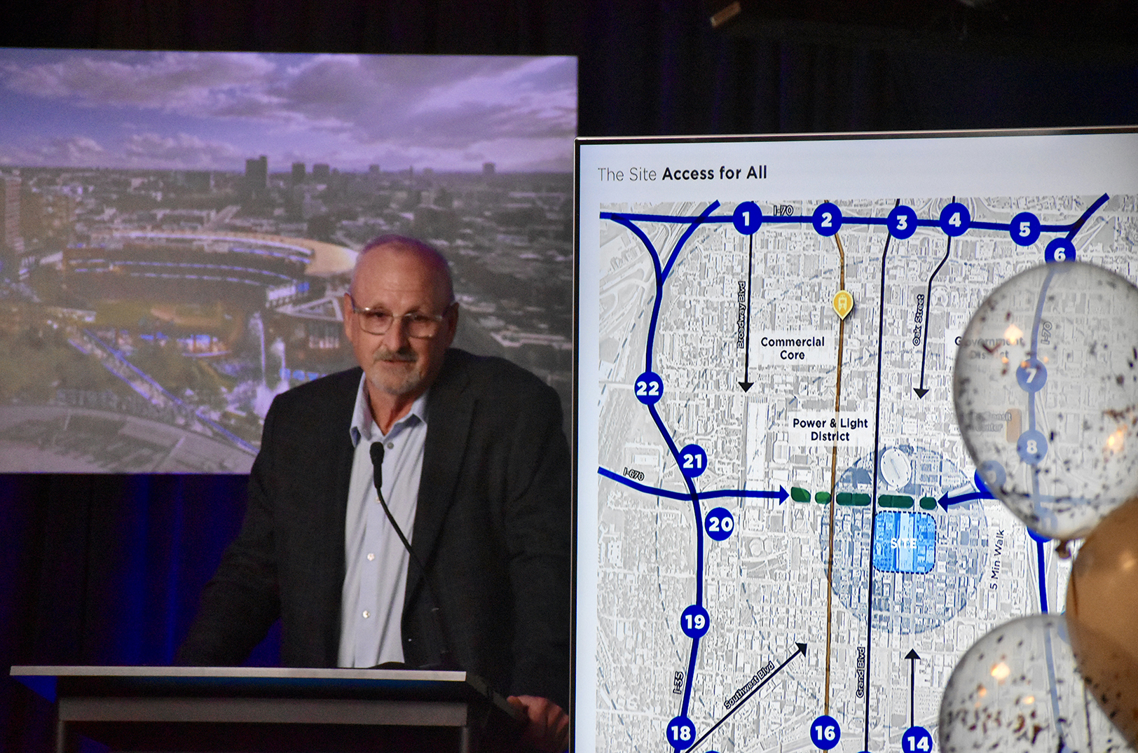 Earl Santee, Populous, speaks during an announcement event at Kauffman Stadium; photo by Nikki Overfelt Chifalu, Startland News