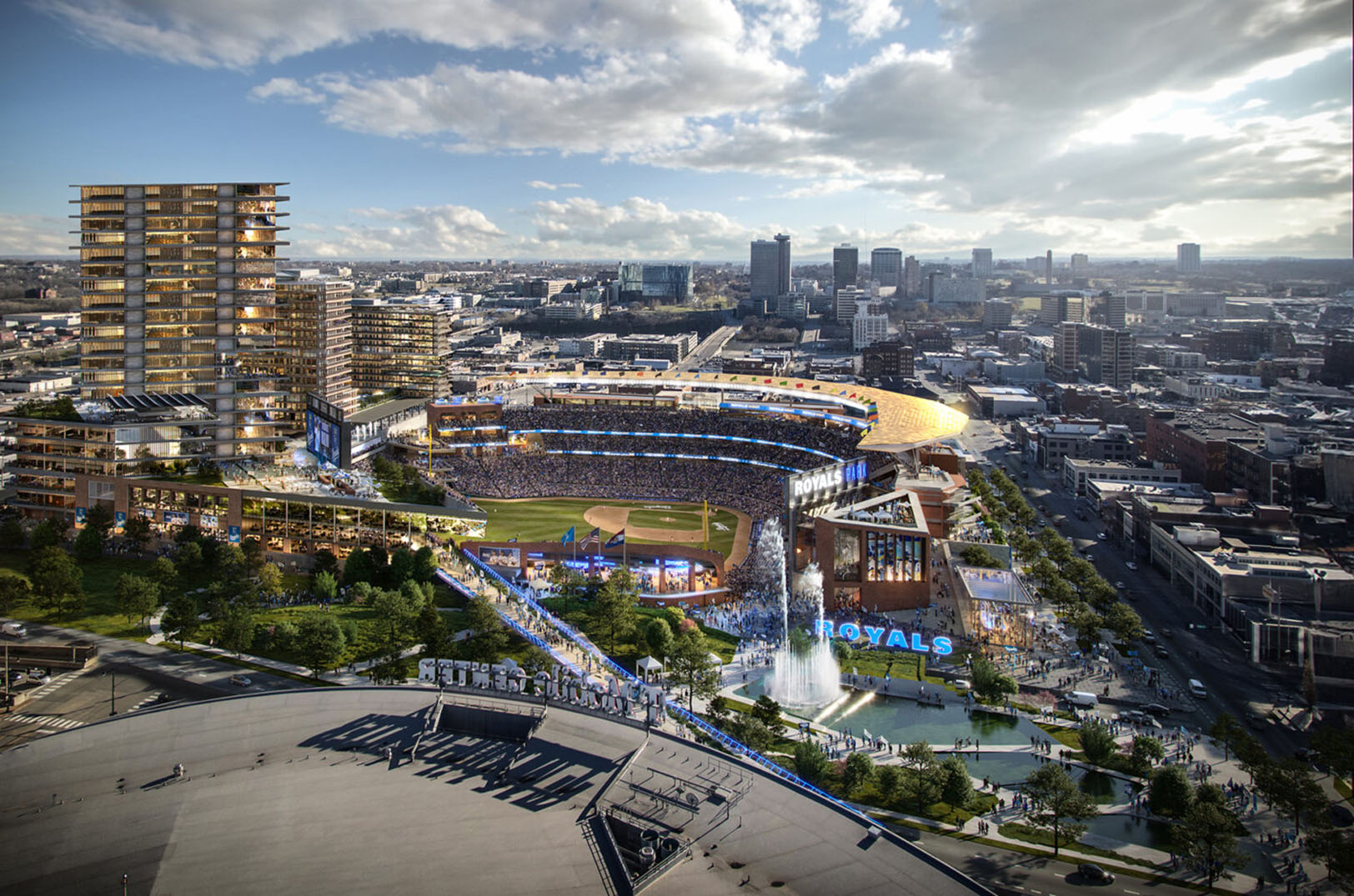 Rendering of the Royals’ proposed ballpark district in the East Crossroads, looking south; rendering courtesy of Populous