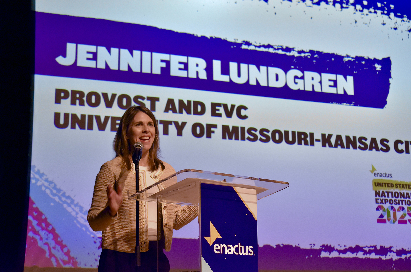 Dr. Jennifer Lundgren, provost and executive vice chancellor at UMKC, welcomes attendees to the Enactus USA expo at UMKC; photo by Nikki Overfelt Chifalu, Startland News