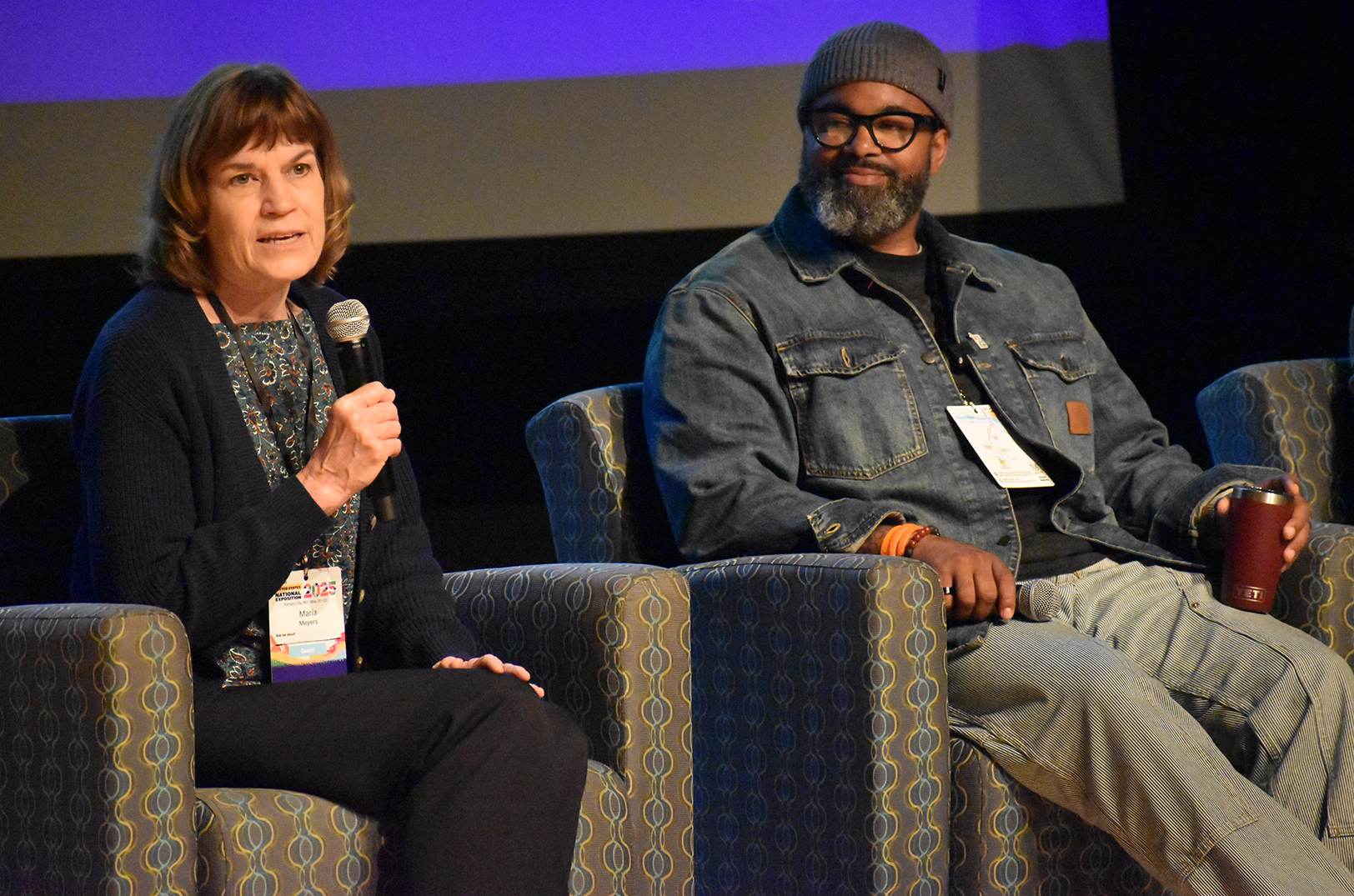Maria Meyers, executive director for UMKC’s Innovation Center, speaks alongside Dan Smith, co–founder of The Porter House KC, during a panel on Kansas City entrepreneurship at UMKC; photo by Taylor Wilmore, Startland News