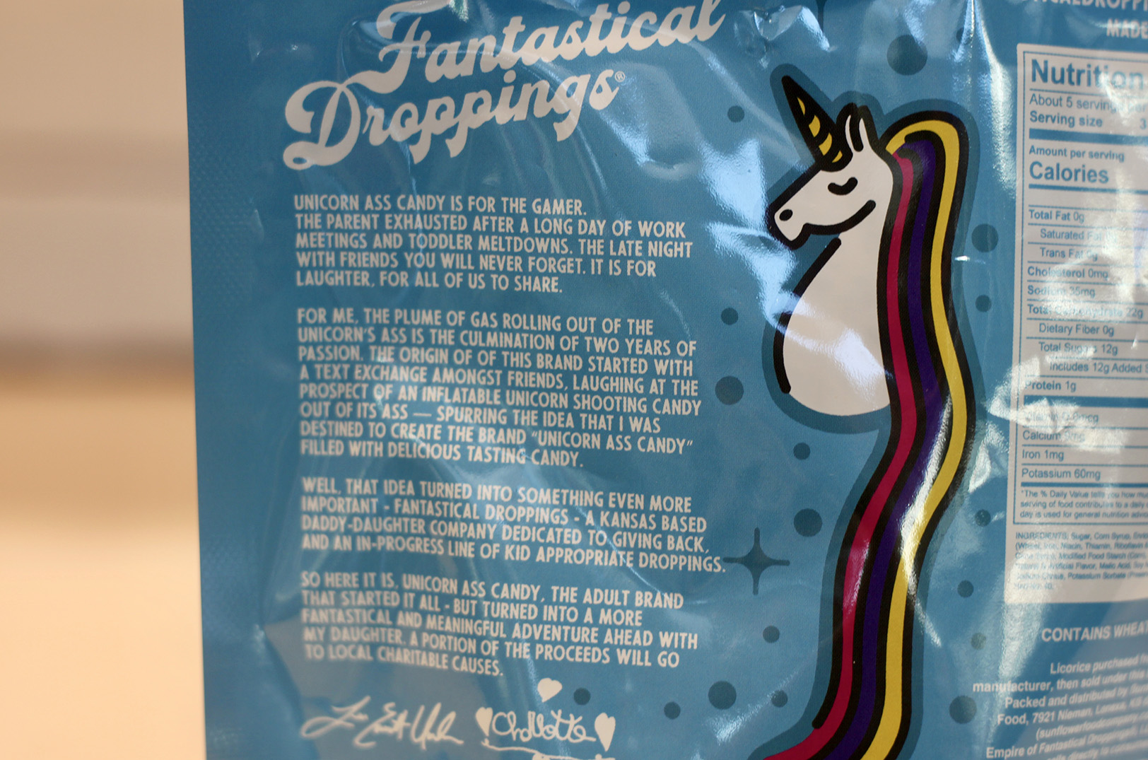 The company currently offers two products — Unicorn Ass Candy and the more-kid-friendly Troll Turds — both strawberry-flavored, soft Australian licorice, complete with poop jokes printed on the bottom, of course.