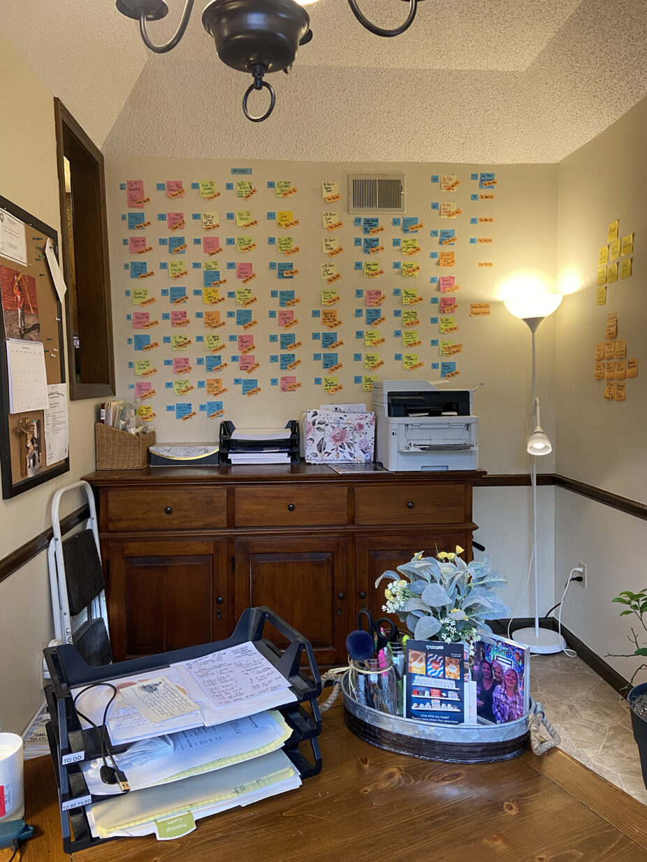Frank Boal and Sarah McEnerney-Boal’s dining room turned office for podcast planning. “There’s not been a meal eaten in there since 2023,” Boal noted; photo by Nikki Overfelt Chifalu, Startland News