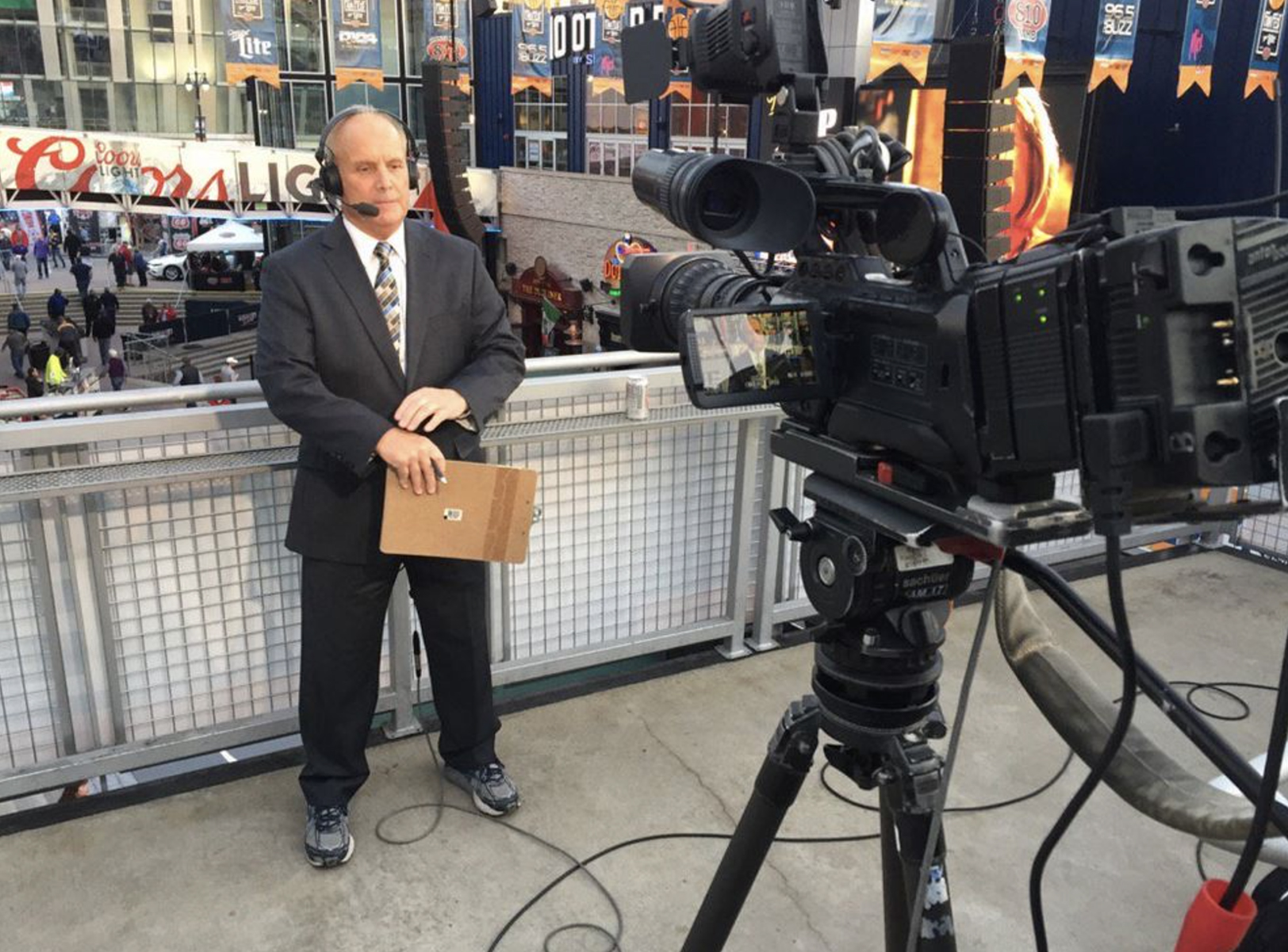 File photo of Frank Boal reporting on-location at the Live! Block at Power & Light for KSHB 41; photo courtesy of the Missouri Sports Hall of Fame