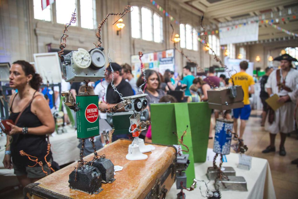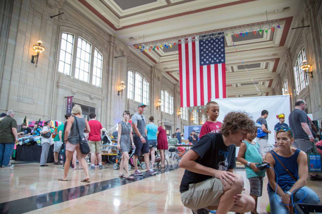 - Hundreds of Maker Faire attendees mingle at Union Station.
