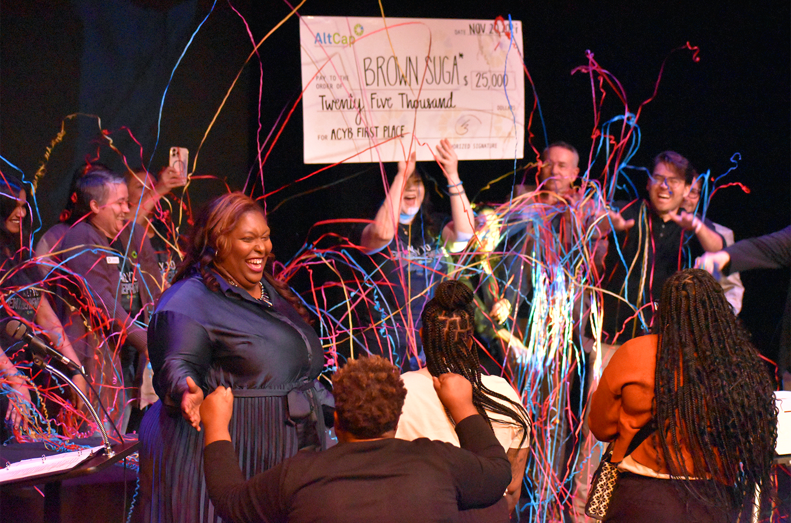 Leaders from Brown Suga race to the stage after winning the 2024 AltCap Your Biz competition during GEWKC; photo by Taylor Wilmore, Startland News