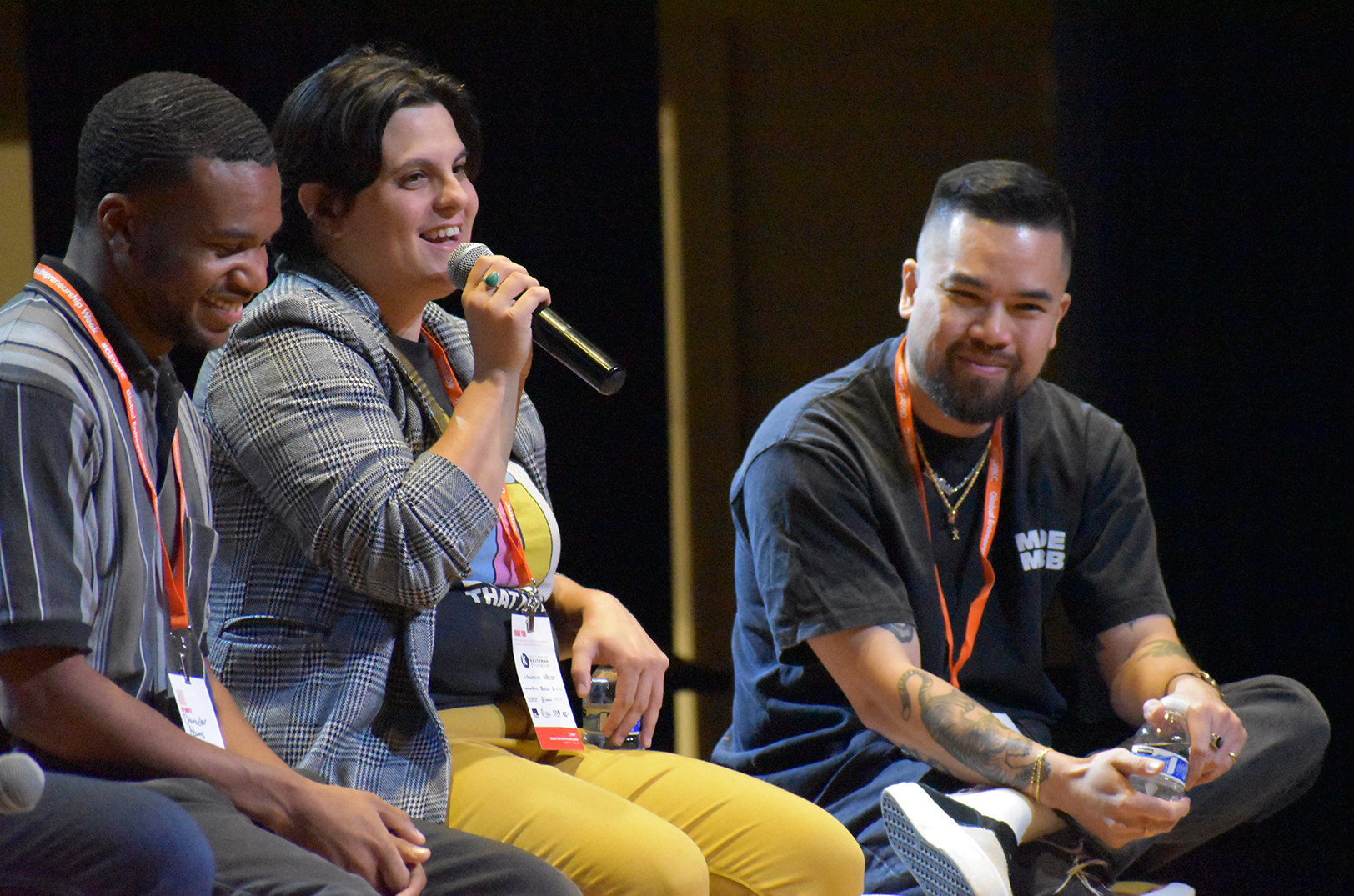 Max Sheffield-Baird, Max Wilde Stories, center, speaks at Global Entrepreneurship Week-Kansas City in 2023 alongside fellow panelists Chancellor Adams, Chancellor’s Promise, and Vu Radley, MADE MOBB; photo by Taylor Wilmore, Startland News
