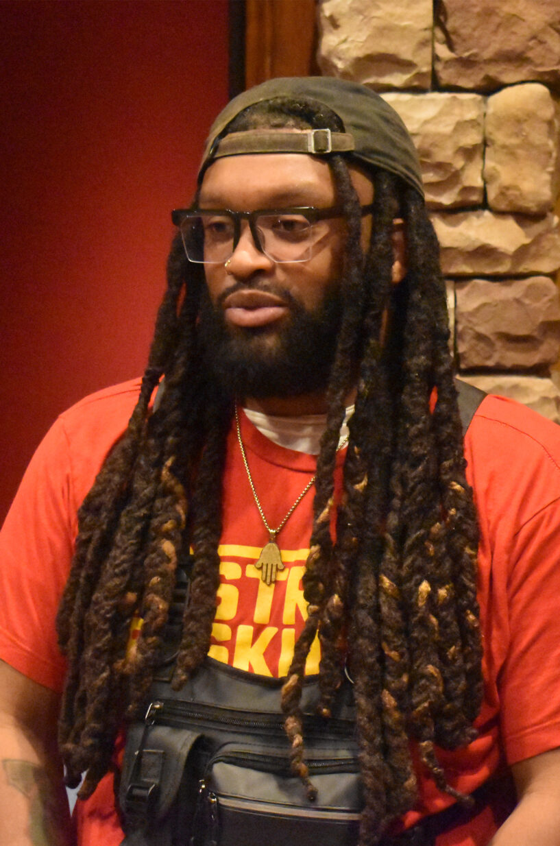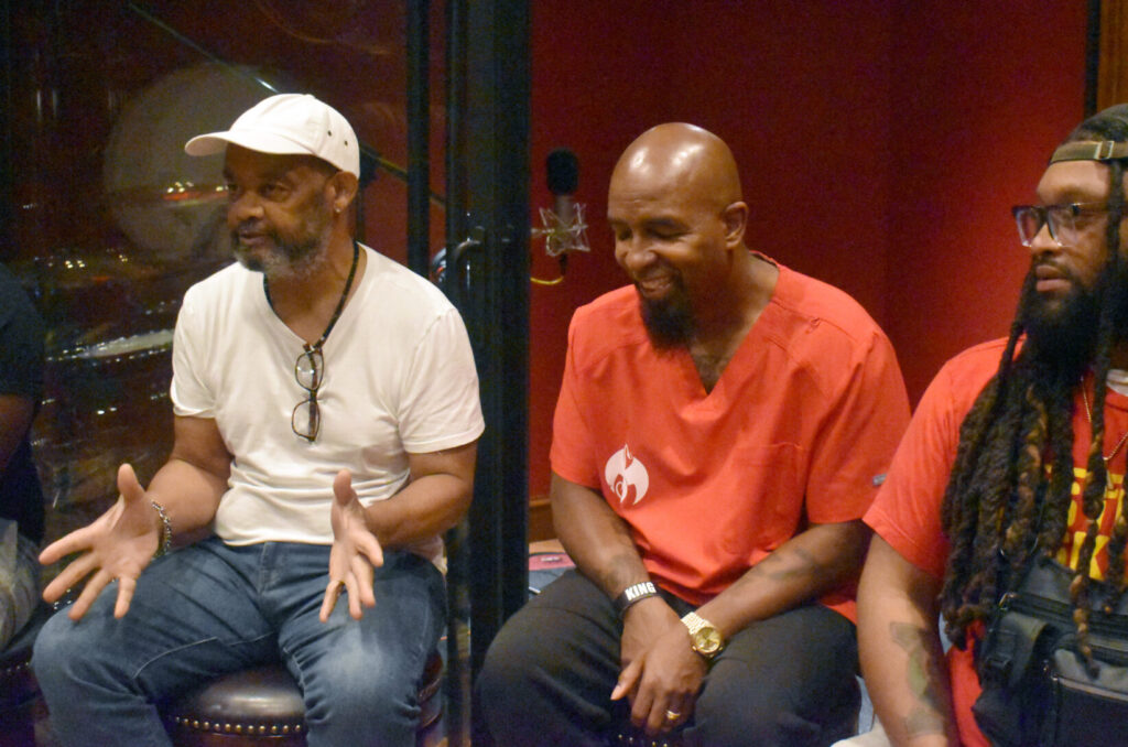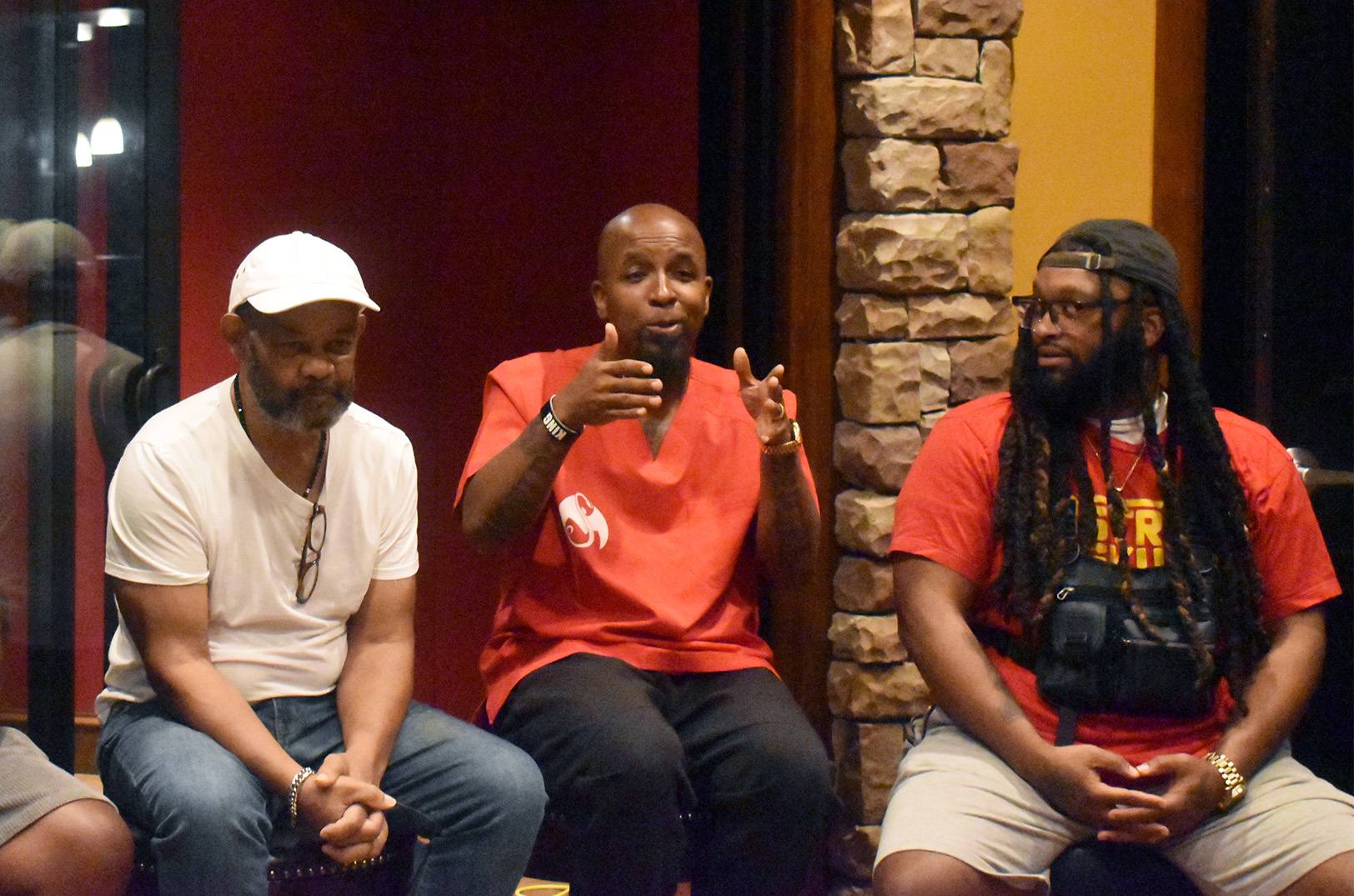 Aaron Dontez Yates, better known as “Tech N9ne,” center, talks about his youth growing up alongside stepfather Hassan Khalifah, left as his stepbrother, Chef Guroux Khalifah, right, looks on; photo by Taylor Wilmore, Startland News