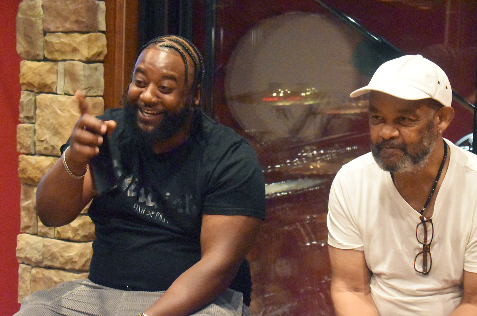 Aaron Dontez Yates, better known as “Tech N9ne,” center, talks about his youth growing up alongside stepfather Hassan Khalifah, left as his stepbrother, Chef Guroux Khalifah, right, looks on; photo by Taylor Wilmore, Startland News