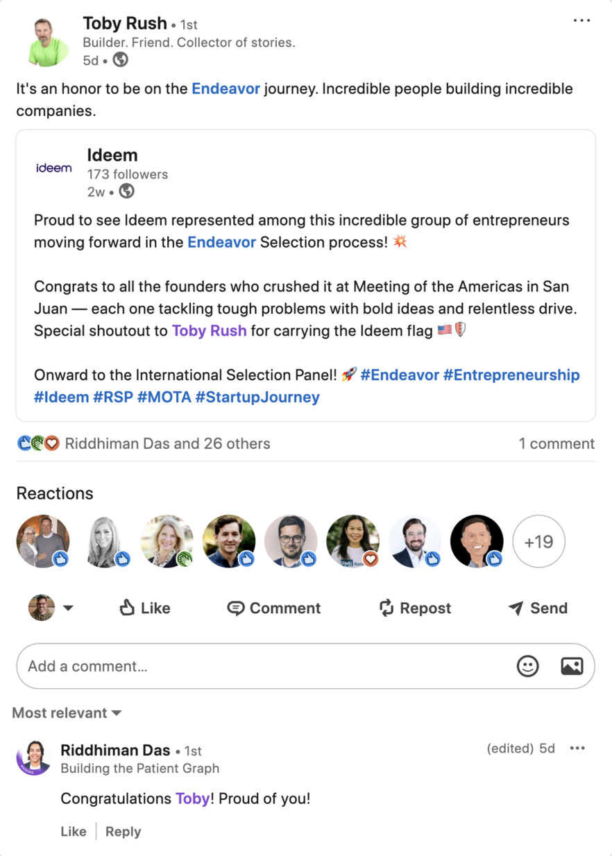 Rush said Endeavor Heartland — an affiliate of the international Endeavor network, which supports high-impact entrepreneurs worldwide — has been “wildly” helpful in making connections in those emerging markets, including introducing Ideem to Quona Ventures.