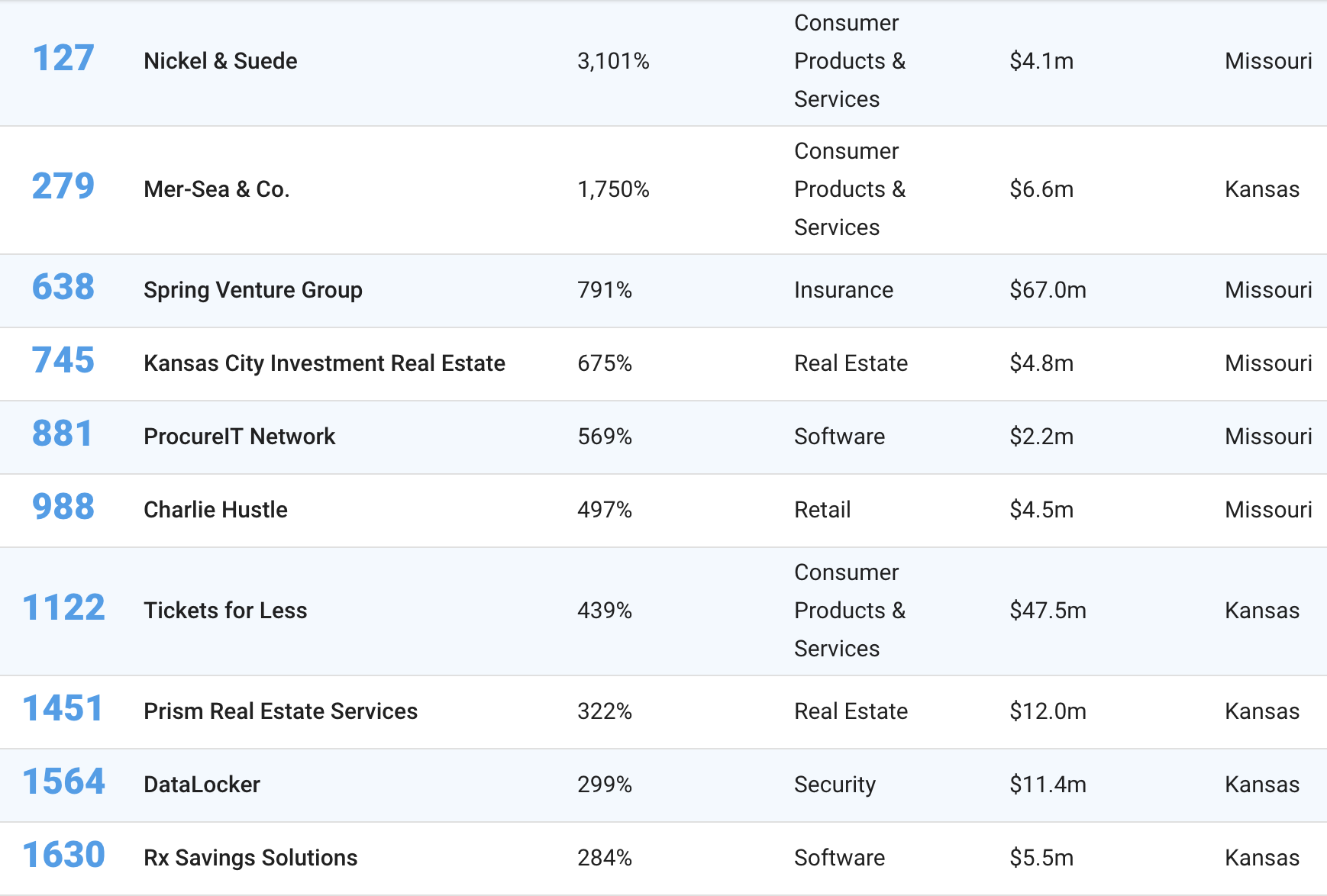 Those two firms — Nickel & Suede (No. 127) and Mer-Sea & Co. (No. 279) — are both in retail. Nickel & Suede, a Liberty-based company that creates handmade leather goods, experienced a 3,101 percent growth with $4.1 million in revenue. Mer-Sea & Co., a Lenexa-based provider of clothing and fashion accessories, reported 1,750 percent growth with $6.6 million in revenue.