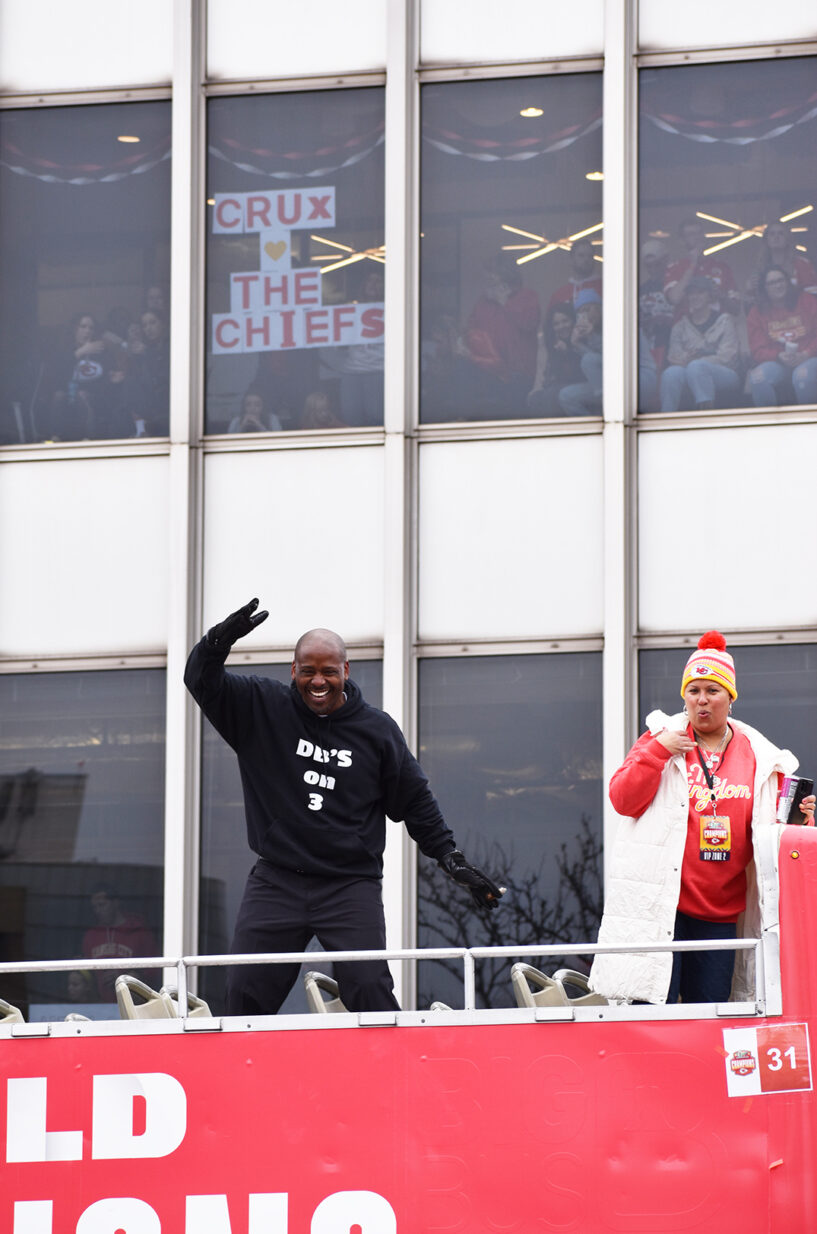 The Kansas City Chiefs’ Super Bowl victory parade in February passes by Crux’s offices on McGee Street, near Crown Center, with Crux team members in the front row seats; photo by Tommy Felts, Startland News