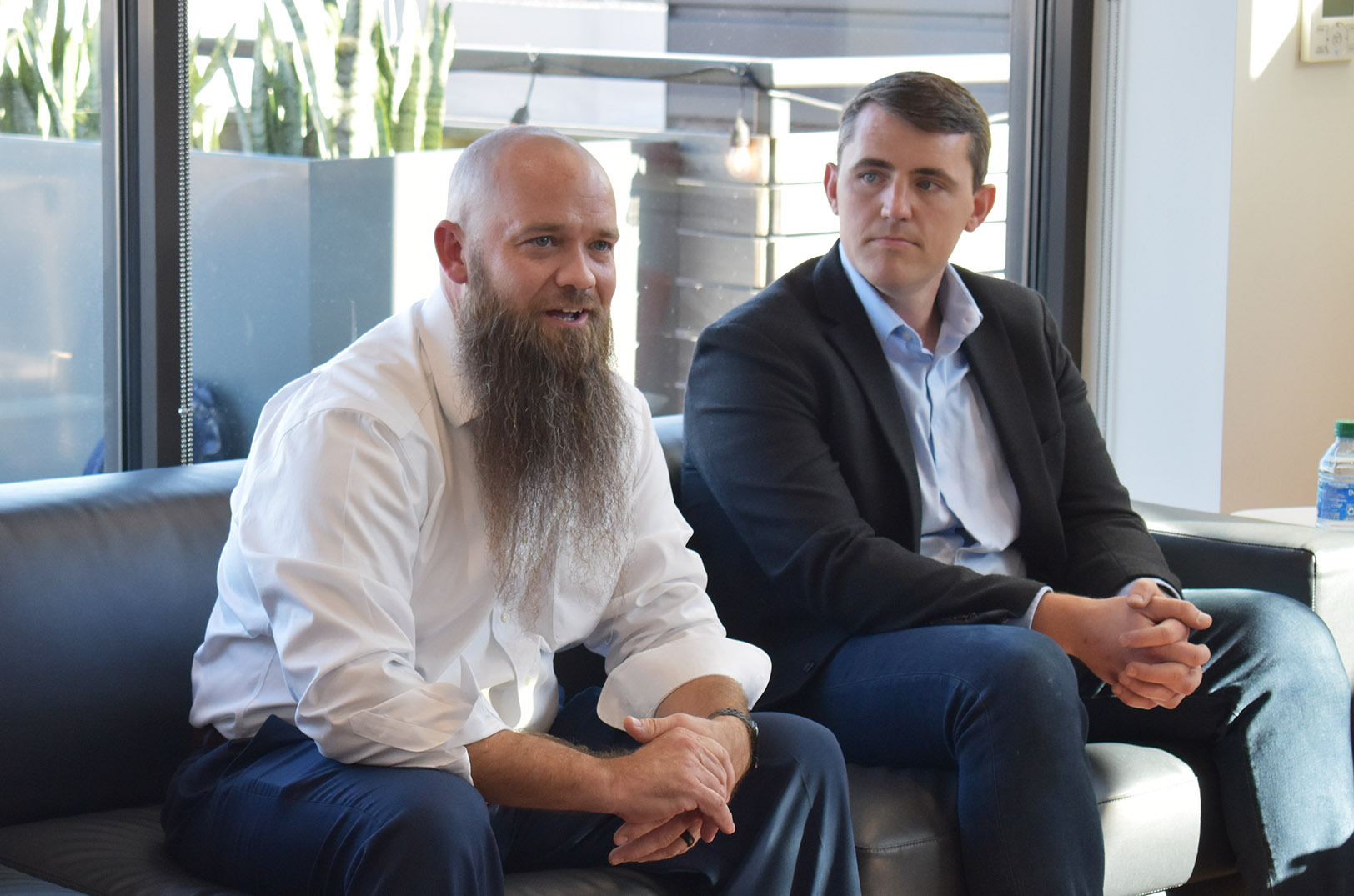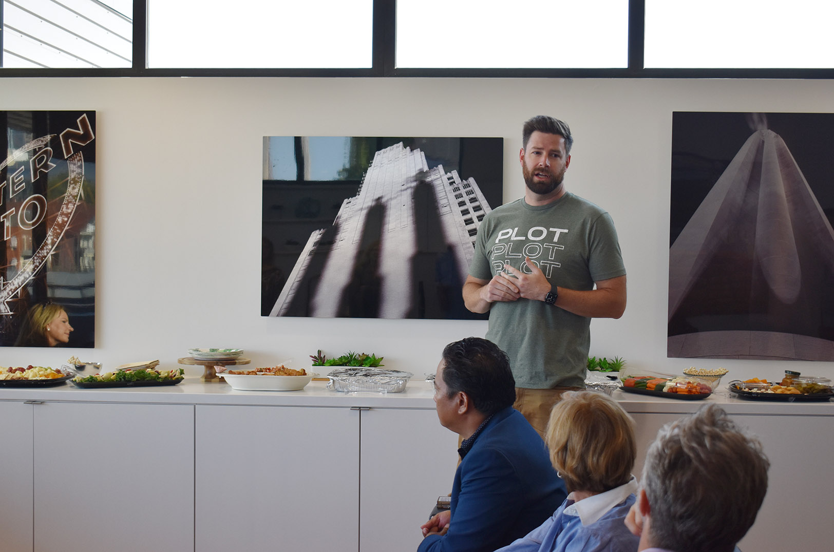 Chris Callen, PLOT, addresses a crowd gathered for an Iron Prairie Ventures panel conversation at Brush Creek Capital; photo by Taylor Wilmore, Startland News