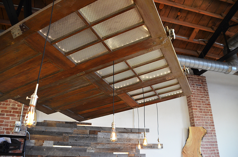Espinosa makes use of five of the former Westport post office’s original doors, which were removed from the building’s exterior to install a glass storefront. Two were joined together to make a sliding barn door leading to Freedom’s kitchenette, while three others hang over an in-the-works bar area.