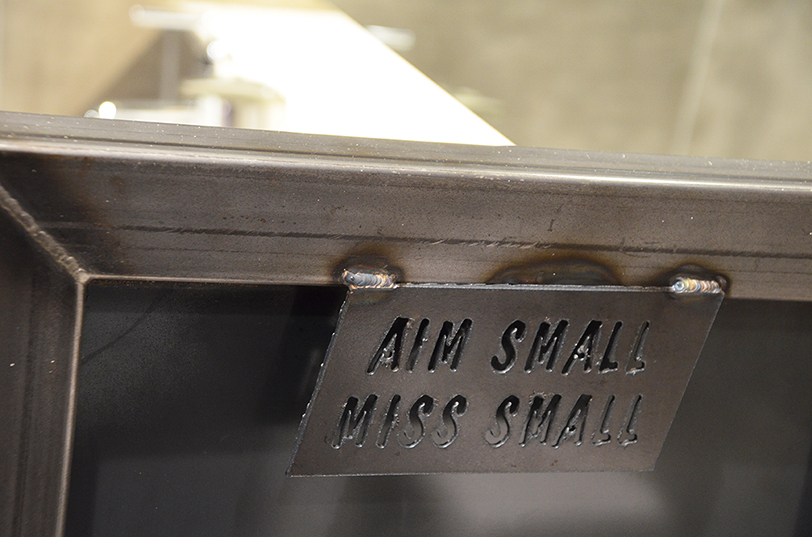 “Everything was custom made,” Espinosa said. “We have an old school urinal in the men’s room and since our welder was military, he made a little sign for us that says, ‘Aim Small, Miss Small.'”