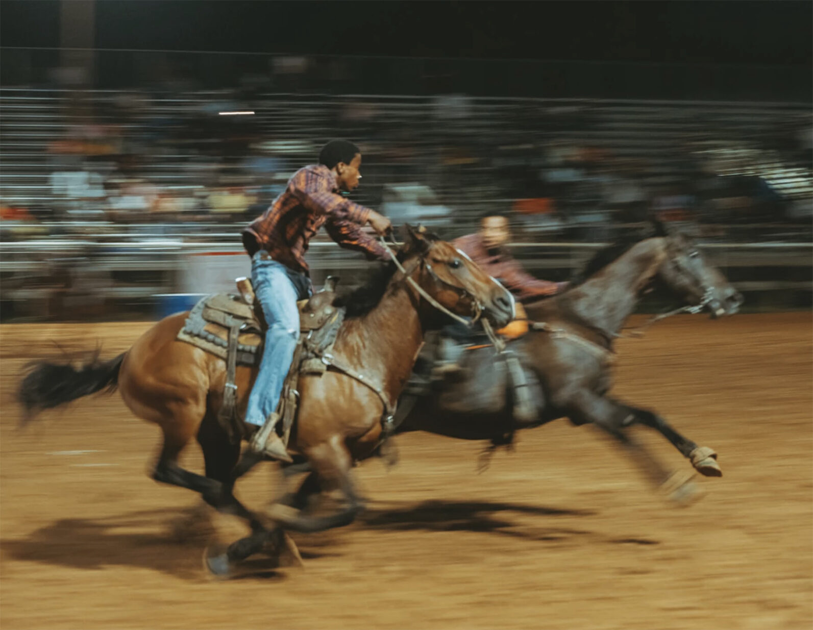 A few of the riders were shirtless with gold chains, basketball shorts and Air Jordans. He saw women with braids billowing behind them and long acrylic nails clutching the reins while riding 50 miles an hour around barrels.
