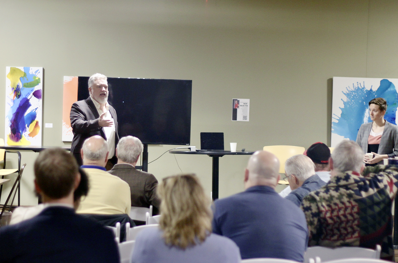 Glen Martin and Conner Hazelrigg, Jewell Unlimited, lead a discussion during a Northland Coffee Connect event Wednesday morning at iWerx Pavilion in North Kansas City