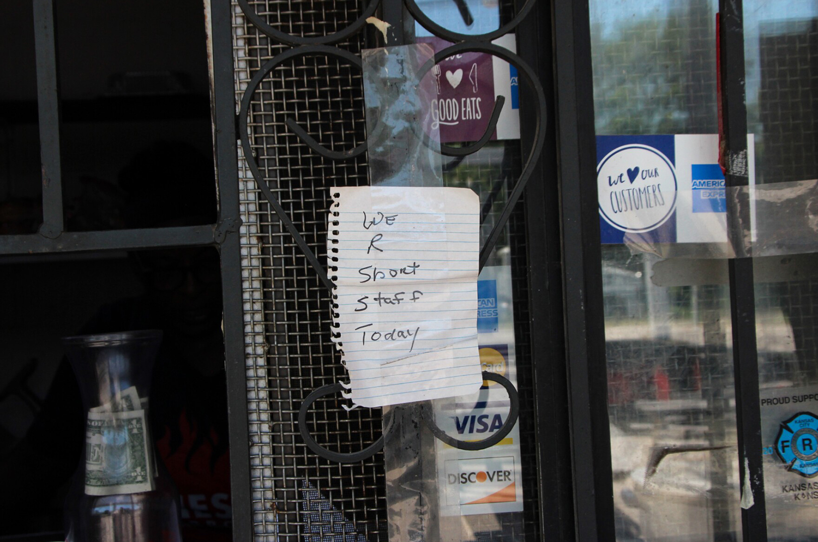 The Jones said one of the reasons they are selling their business is because they are short of staff. This note hung from the order window Thursday. Photo by Bek Shackelford-Nwanganga/KCUR 89.3
