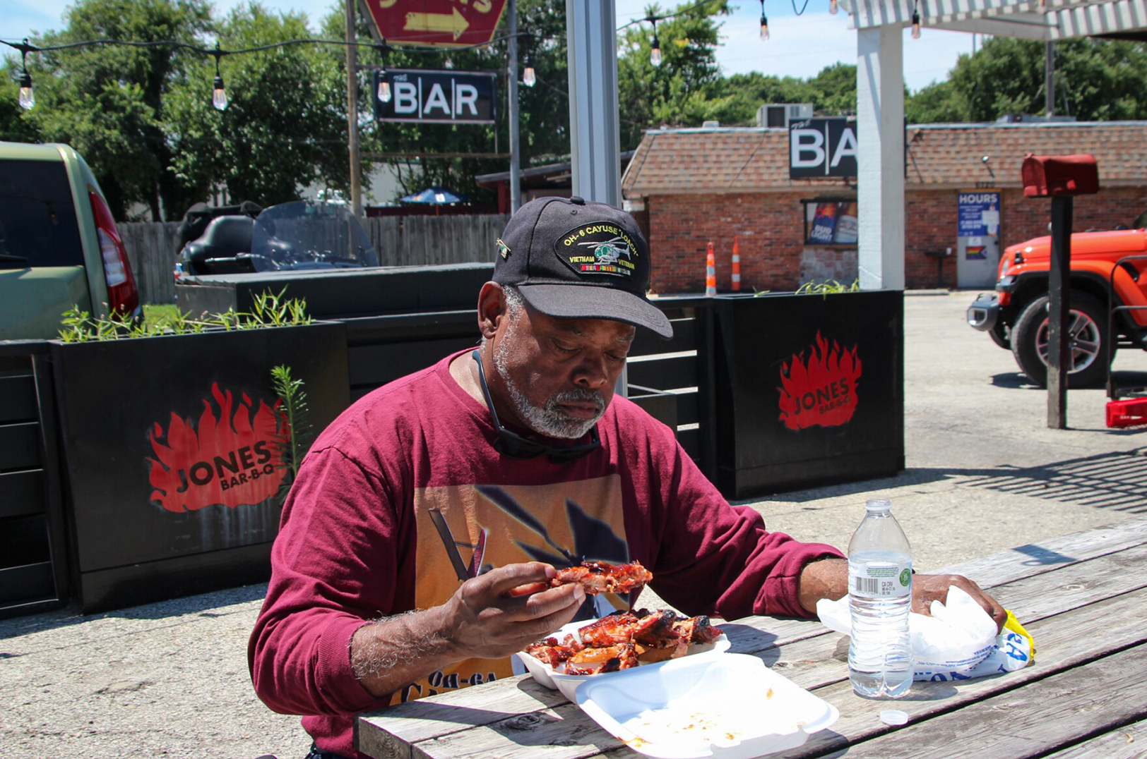 Rick Wheaton, enjoying his lunch Thursday. He said he wanted to try Jones Bar-B-Q ever since he saw them on Queer Eye, so he drove from the Raytown area to Kansas City, Kansas to meet the sisters before they leave. Photo by Bek Shackelford-Nwanganga/KCUR 89.3