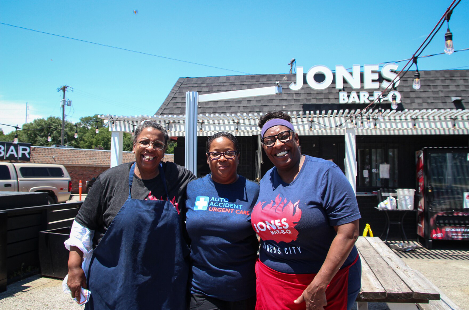 Detra Wilson, a longtime patron and family friend of Jones Bar-B-Q, stands between Deborah “Little” Jones and Mary “Shorty” Jones. Photo by Bek Shackelford-Nwanganga/KCUR 89.3