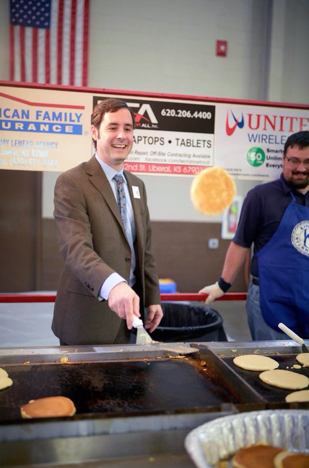 Josh Svaty, then a Democratic candidate for Kansas governor, flips pancakes on the campaign trail in Liberal; photo courtesy of Josh Svaty