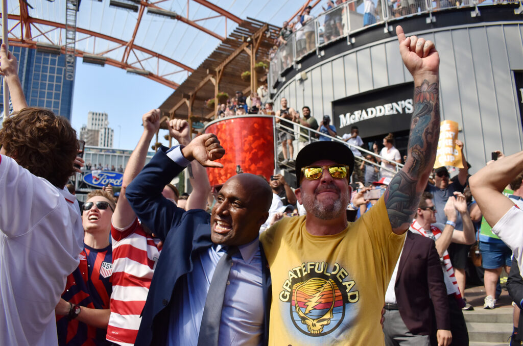 Mayor Quinton Lucas cheers alongside fans June 16, 2022, at Power & Light as news breaks that Kansas City will host during the 2026 World Cup; Photo by Channa Steinmetz, Startland News