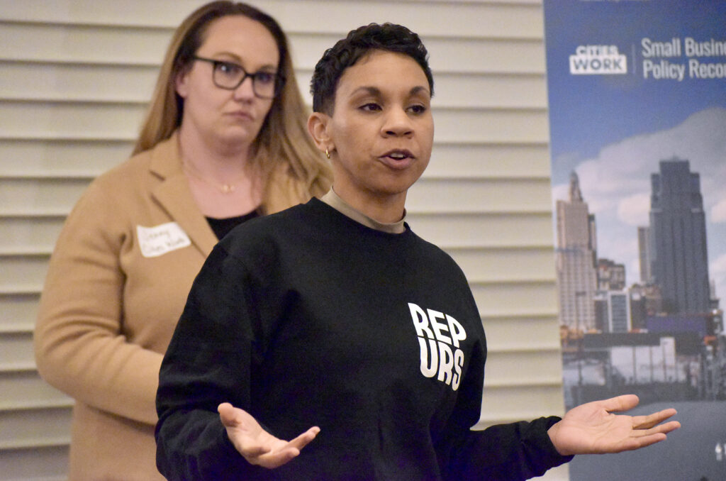 Nia Richardson, KC BizCare, speaks during a March 2024 event celebrating entrepreneurship and revealing Cities Work’s study on KCMO; photo by Nikki Overfelt Chifalu, Startland News