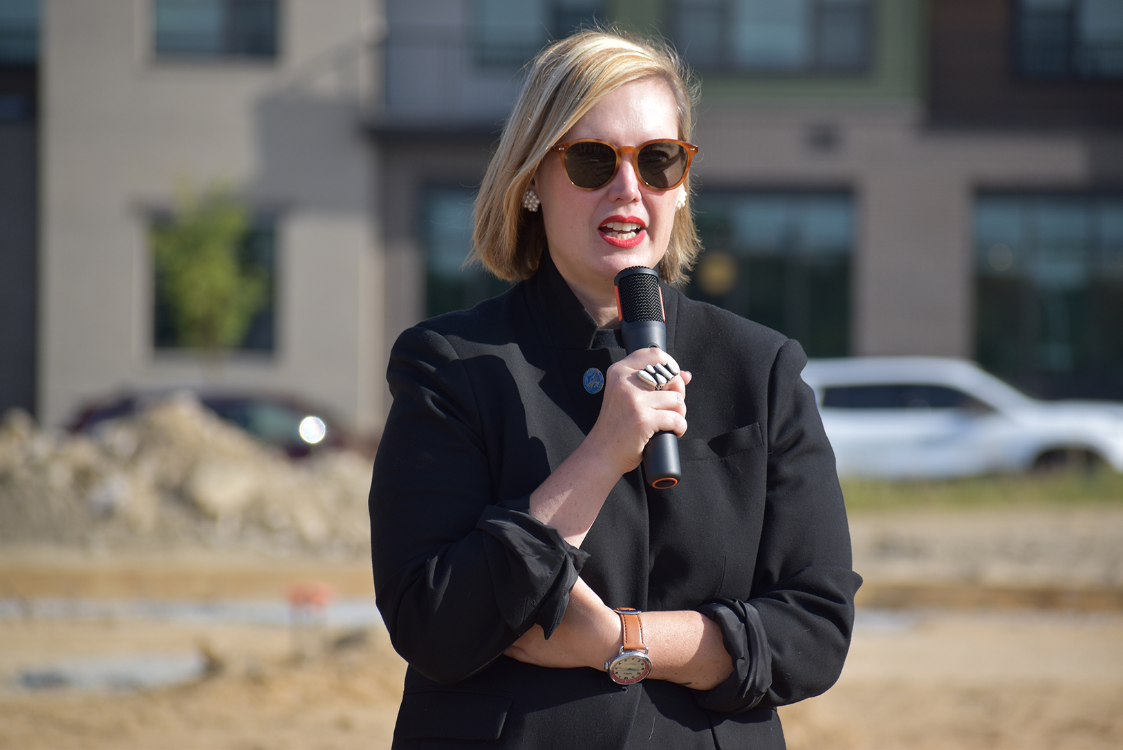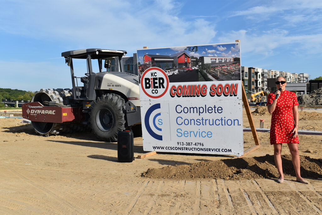 Camille Christie, West Star Development, speaks during KC Bier Co.’s groundbreaking ceremony for the brewery’s expansion at the new Vista Village district in Lenexa; photo by Taylor Wilmore, Startland News