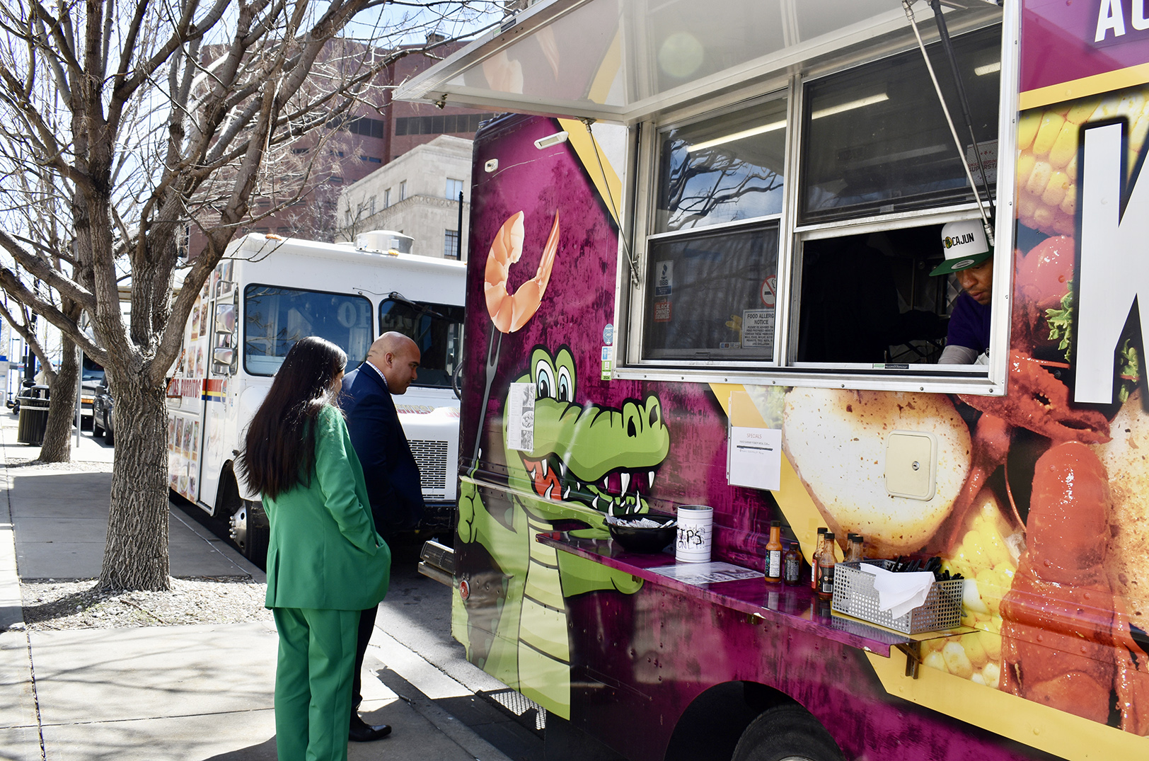 Diners view the menu at the KC Cajun food truck across from the Jackson County Courthouse in downtown Kansas City; photo by Nikki Overfelt Chifalu, Startland News