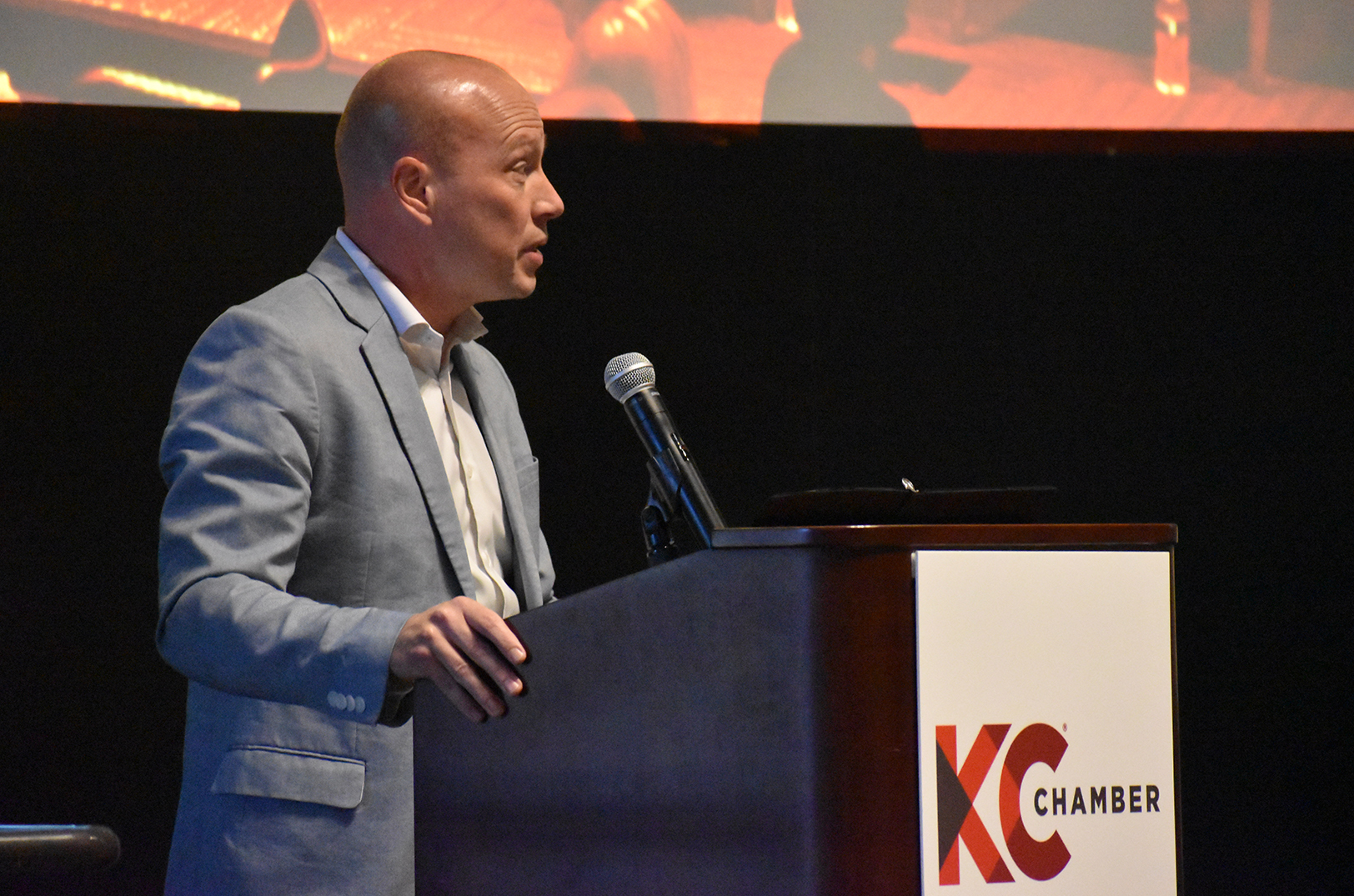 David Pruente, chief strategy officer for the KC Chamber, opens a breakfast panel conversation with the finalists KC Chamber’s Small Business of the Year; photo by Taylor Wilmore, Startland News