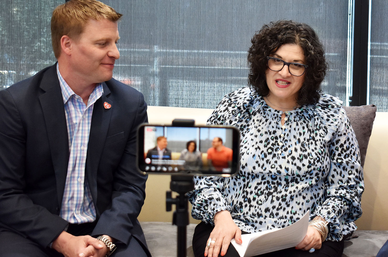 Eric Wollerman, Honeywell FM&T, and Vicky Kulikov, Greater Kansas City Chamber of Commerce, announce the 2023 KCNSC Fan Favorite awards at Spark Coworking in downtown Kansas City; photo by Channa Steinmetz, Startland News