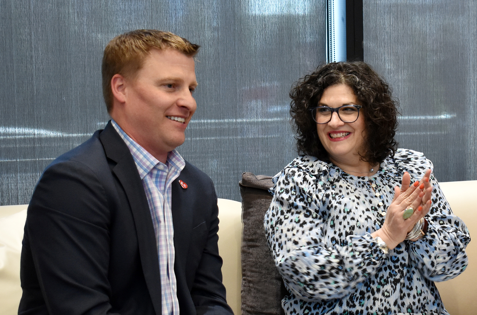 Eric Wollerman, Honeywell FM&T, and Vicky Kulikov, Greater Kansas City Chamber of Commerce, announce the 2023 KCNSC Fan Favorite awards at Spark Coworking in downtown Kansas City; photo by Channa Steinmetz, Startland News