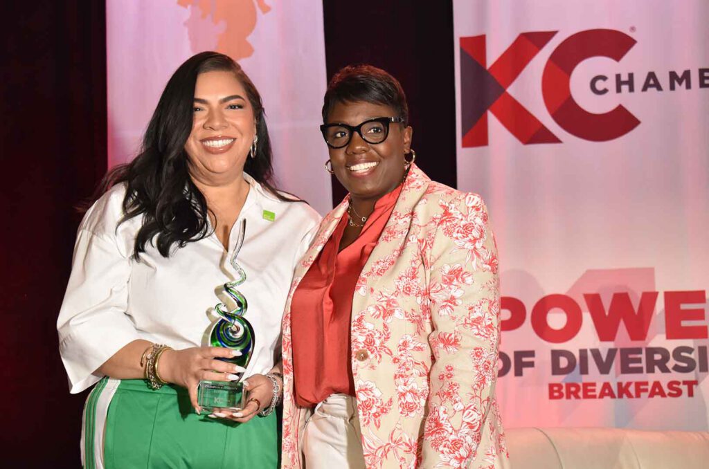LeAna Flores, the director of diversity, inclusion, and belonging for H&R Block, accepts the Champion of Diversity Award from Stephanie Robinson, chief diversity officer at Lockton, the 2023 winner, during the KC Chamber’s POWER of Diversity Breakfast; photo by Taylor Wilmore, Startland News