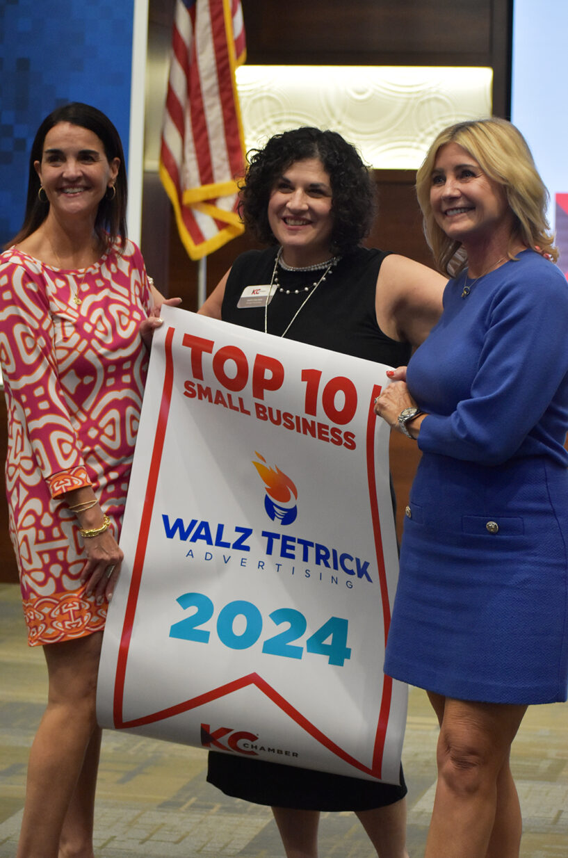 Leaders from Walz Tetrick Advertising pose with Vicky Kulikov, KC Chamber, the Top 10 announcement at UMB Bank during a KC Chamber Small Business Celebration reveal event; photo by Sherry and Ken Lumpkins, Blue Symphony, react to the Top 10 announcement at UMB Bank during a KC Chamber Small Business Celebration reveal event; photo by Nikki Overfelt Chifalu, Startland News
