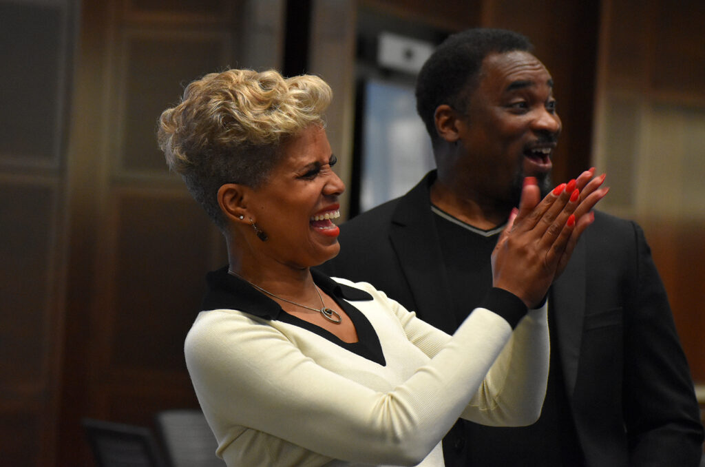 Sherry and Ken Lumpkins, Blue Symphony, react to the Top 10 announcement at UMB Bank during a KC Chamber Small Business Celebration reveal event; photo by Nikki Overfelt Chifalu, Startland News