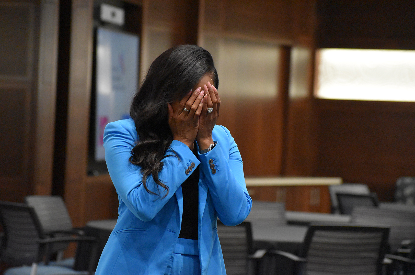 Joan Charbonneau, Perfect Promotions, reacts to the Top 10 announcement at UMB Bank during a KC Chamber Small Business Celebration reveal event; photo by Tommy Felts, Startland News