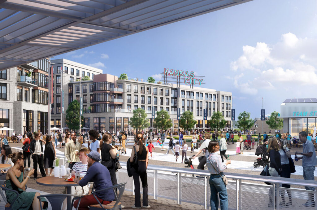 Redevelopment plans call for a town square between the KC Current stadium and the mixed-used project to the west; rendering courtesy of the KC Current