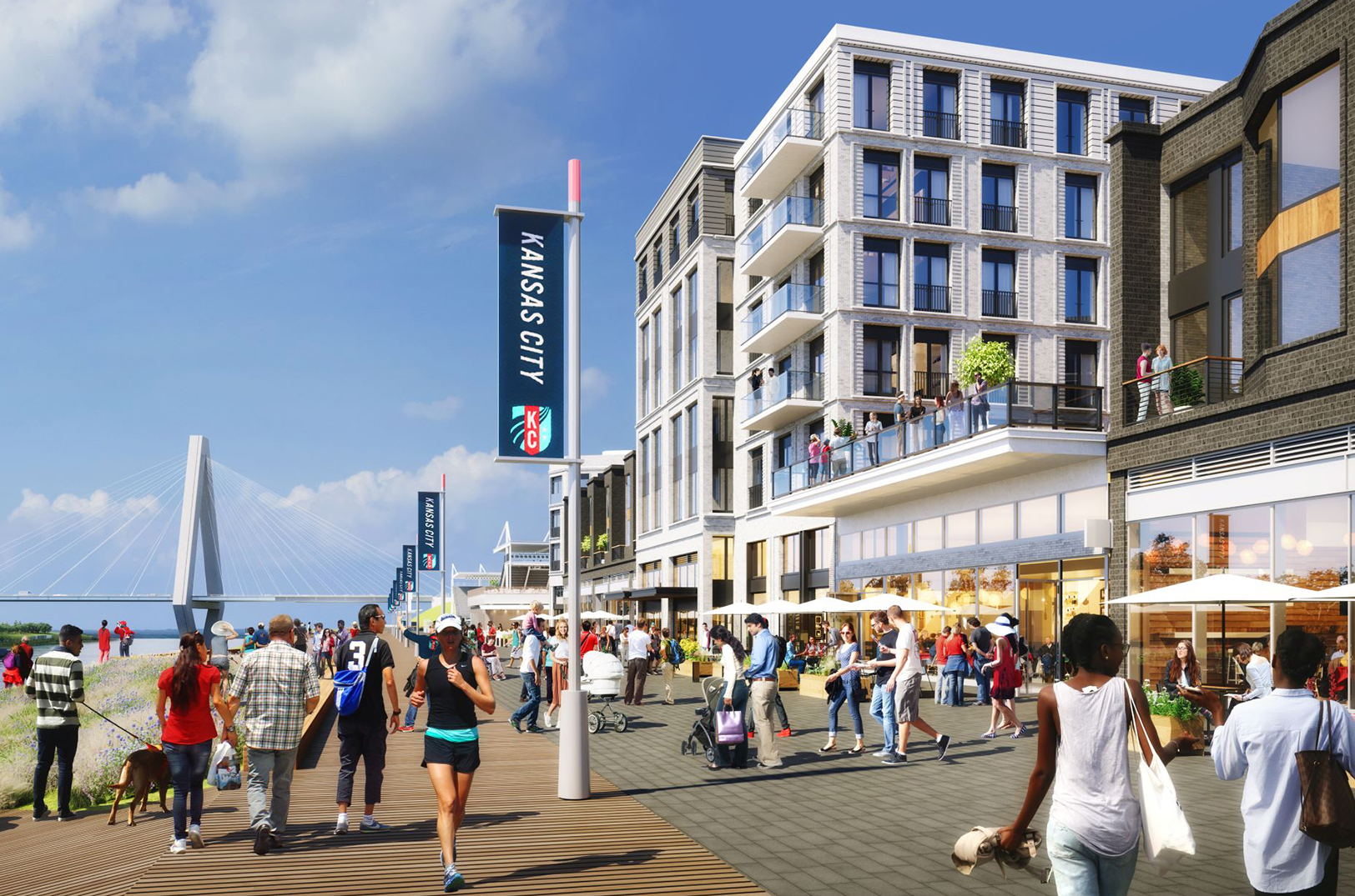 A rendering of a pedestrian walkway between apartments and the riverfront; rendering courtesy of the KC Current