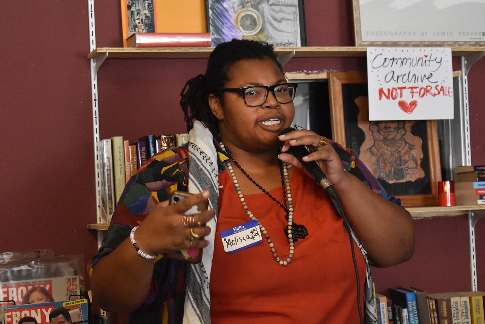 Nina Kerrs, a Mutual Aid organizer with The Kansas City Defender, speaks during a retirement event for Willa Robinson at Willa’s Books and Vinyl; photo by Taylor Wilmore, Startland News