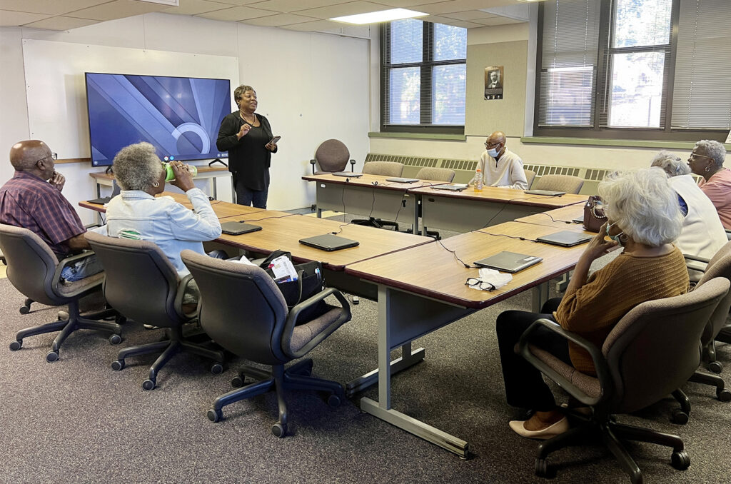 Grantee Rosalyn Sykes, Black Family Technology Awareness Association (BFTAA), teaches a class on digital literacy where participants get a laptop device when they successfully complete 15 hours of training; photo courtesy of KC Digital Drive
