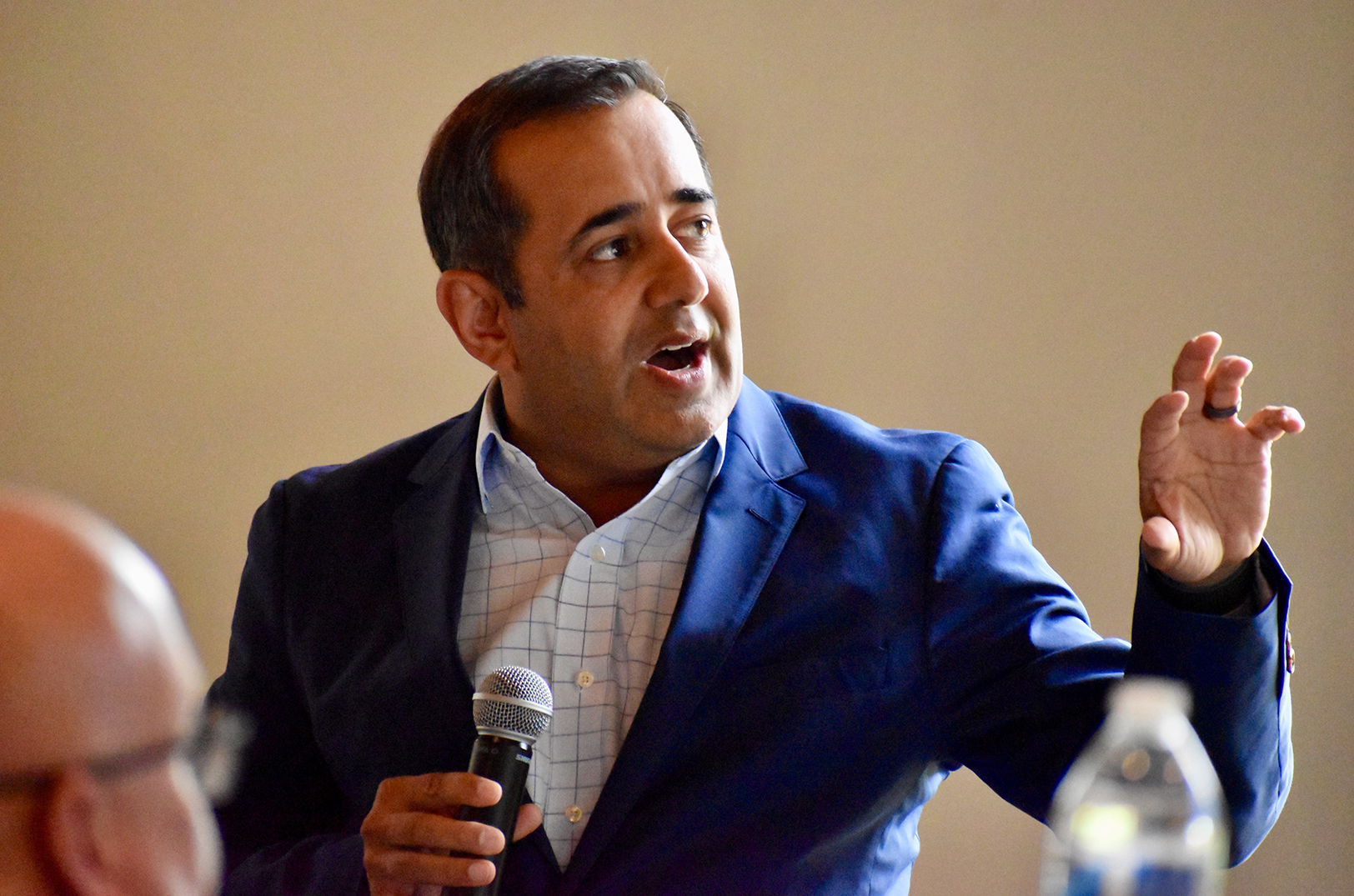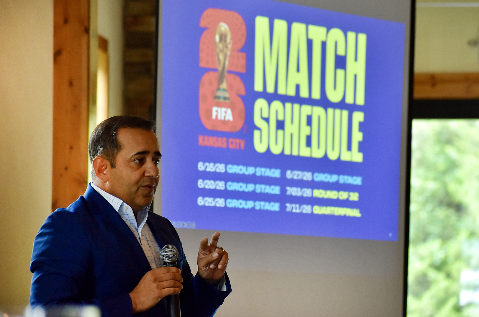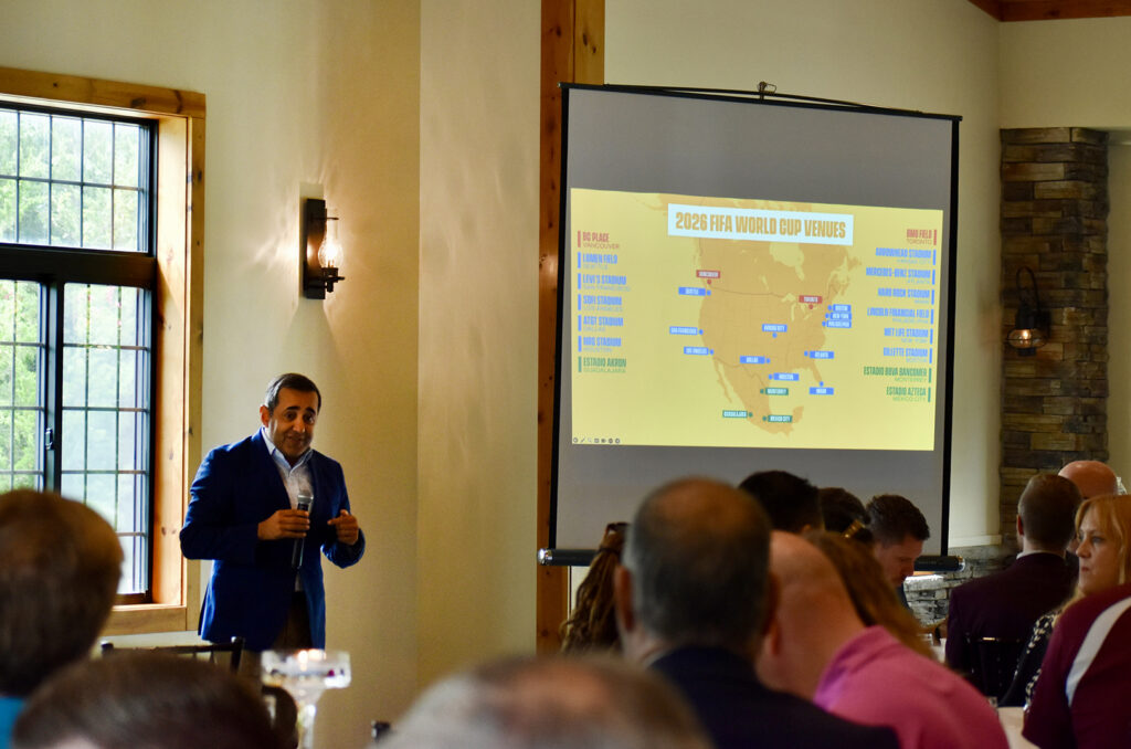 Neal Sharma, a member of the KC 2025 World Cup Organizing Committee, speaks during the “Over The Fence” World Cup update luncheon at The Venue in Kansas City, Kansas; photo by Nikki Overfelt Chifalu; Startland News