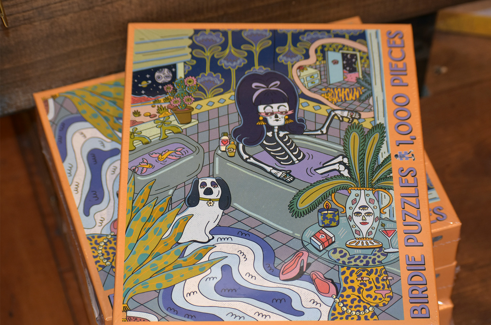 This holiday season, designs by UK artist and illustrator Emily M. Reay have proven to be trippy Birdie best-sellers at Made in KC locations. “Mama Told Me” and “Party Down” have lead the way for puzzle enthusiasts snatching up the colorful some-assembly-required art pieces.