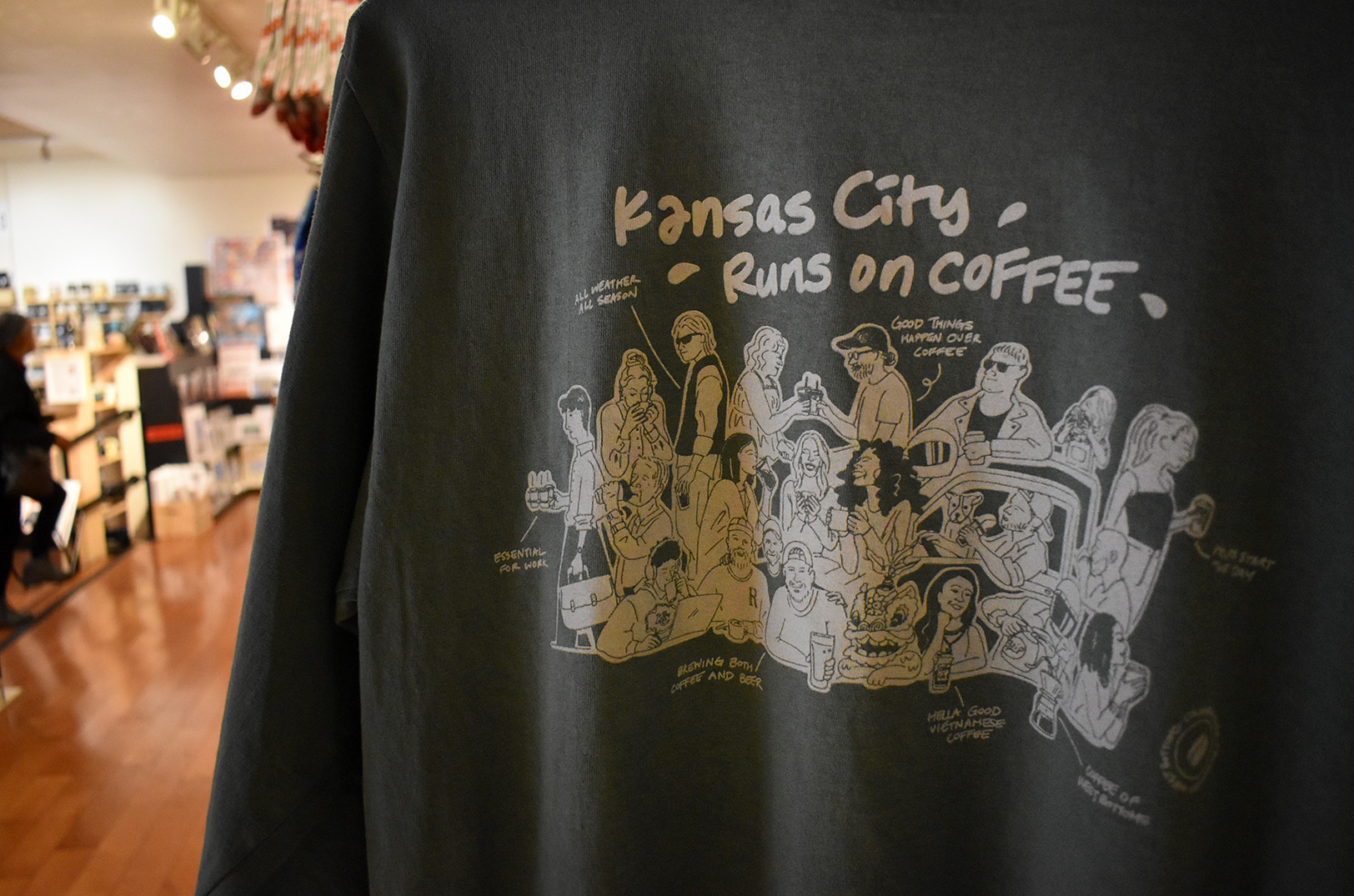 Kansas City Runs on Coffee shirt from Associated Humanity at Made in KC’s Country Club Plaza location; photo by Tommy Felts, Startland News