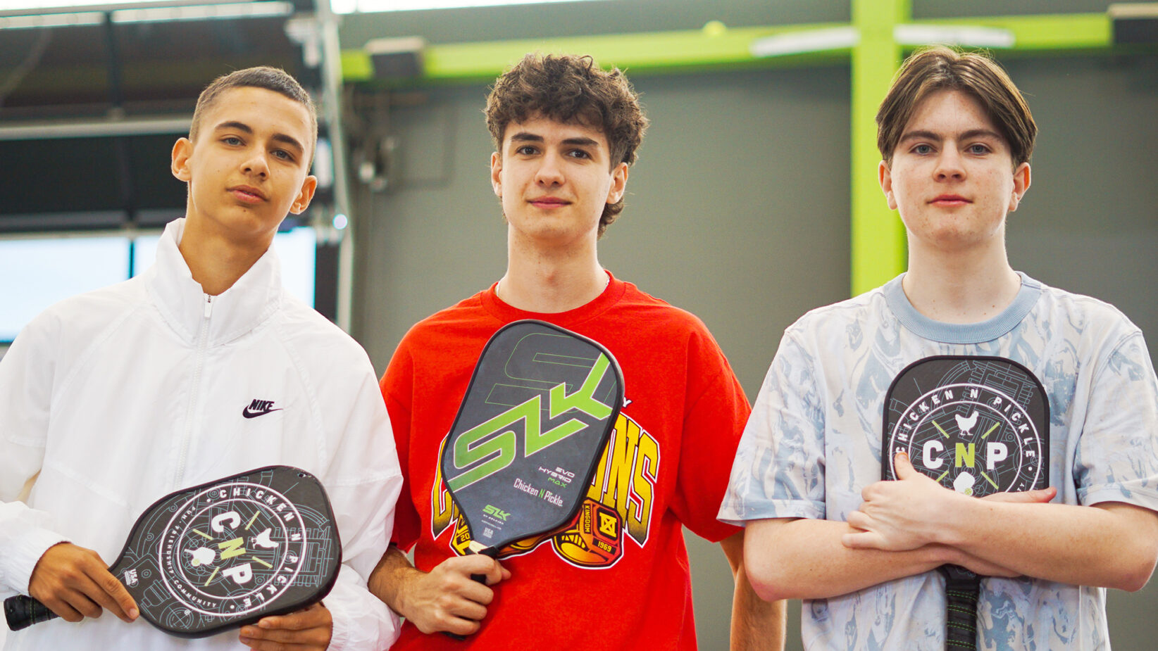 Hunter Tomeski, Ethan Klumpp, and Jon Anastasakis, Kansas City Pioneers Rocket League team, at Chicken N Pickle; photo courtesy of the KC Pioneers