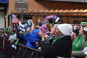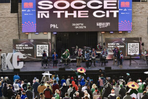 A fan stands tall amid a crowd gathered in the Live! Block at Power and Light for Kansas City’s FIFA World Cup Final Draw rally; photo by Nikki Overfelt Chifalu, Startland News