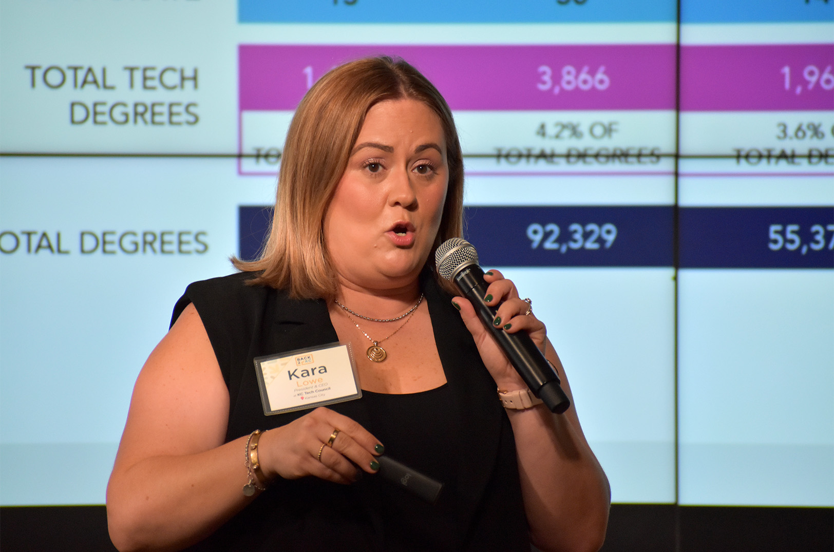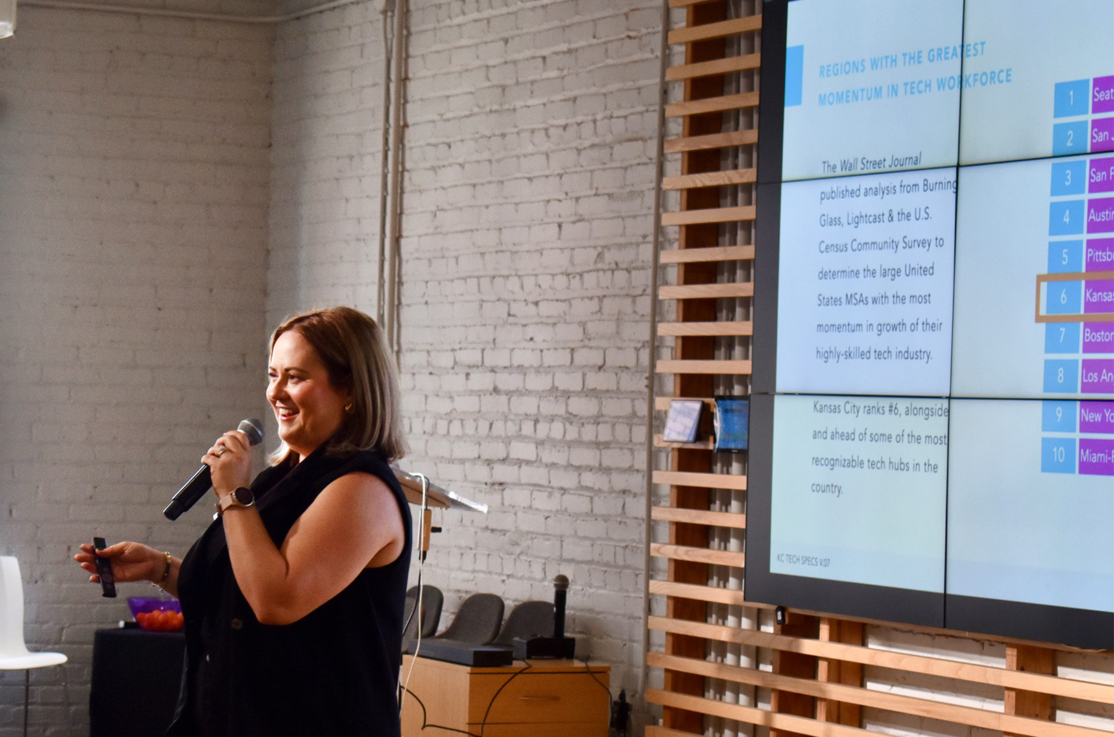 Kara Lowe, KC Tech Council, presents findings from the 2024 Tech Specs report to a crowd of Back2KC participants; photo by Taylor Wilmore, Startland News